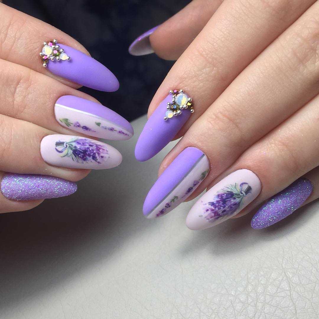 Рисунки в виде нежных и милых цветов – это неизменный тренд для всех времен. Несмотря на то, что мастера маникюра не перестают удивлять нас новыми и головокружительными идеями нейл-арта, популярность рисунков в виде цветов ни капельки не иссякла. В зависимости от вкуса девушки и стиля мероприятия, можно выбрать для себя невероятные и изысканные варианты рисунков с цветами. Для девушек, которые предпочитают простоту в дизайне нейл-арта, мастера предлагают лаконичные листочки, стебельки и бутончики. Такой маникюр в сочетании с фиолетовым френчем выглядит очень романтично и нежно