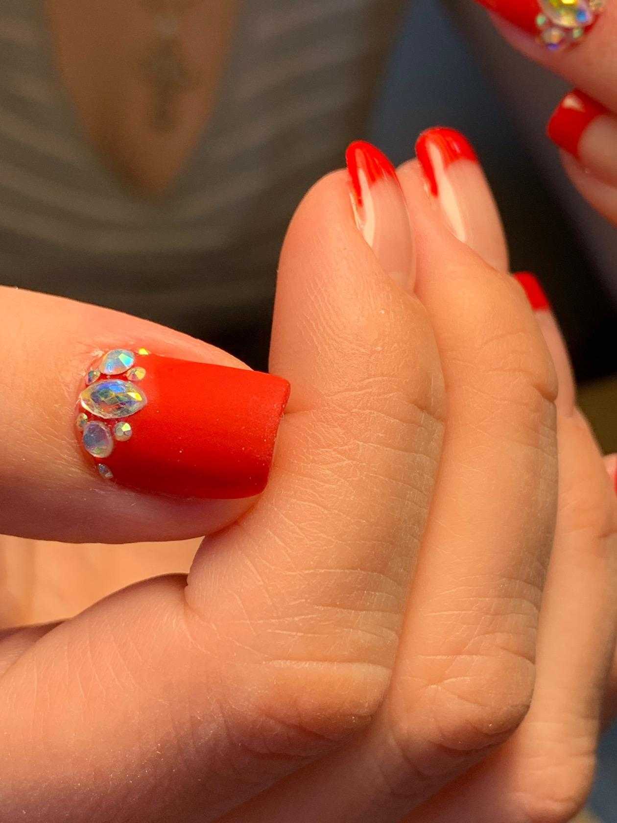 Современным и оригинальным решением для лета является оранжевый френч. Кстати нередко основное покрытие делают в этом оттенке, а линию улыбки оставляют в классическом белом цвете. Благодаря чему сочетается классический и современный подход. Несмотря на то, что маникюр смотрится достаточно ярко, при этом его украшают стразами. Такой вариант подойдет только смелым, уверенным в себе девушкам, которые стремятся к новому. Различные рисунки — довольно частое дополнение
