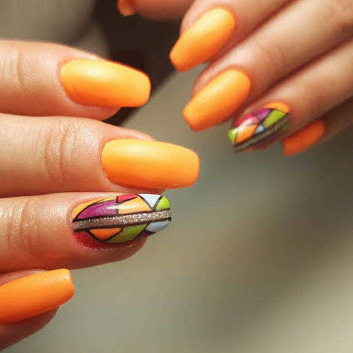 Матовый цветной маникюр практически не нуждается в дополнительном декоре. Если количество оттенков в дизайне превышает 3, то лучше не дополнять его стразами, слайдерами или стемпингом. Шикарно выглядят нейл-арты с геометрическими узорами. При этом также стоит придерживаться умеренности и выполнять вместо сложных узоров с треугольниками и ромбами, дизайн со штрихами, мазками, тонкими линиями.