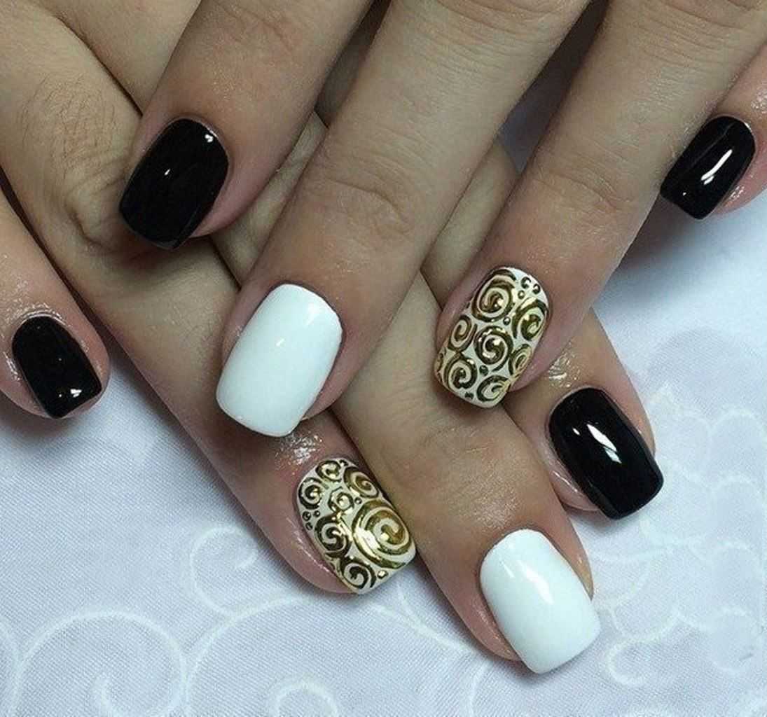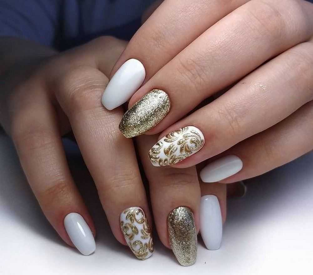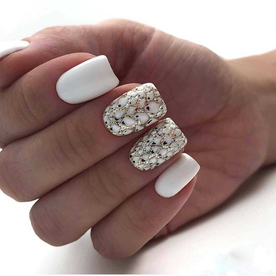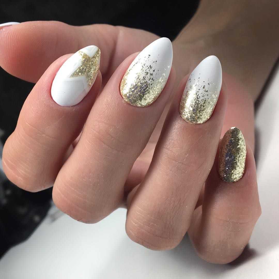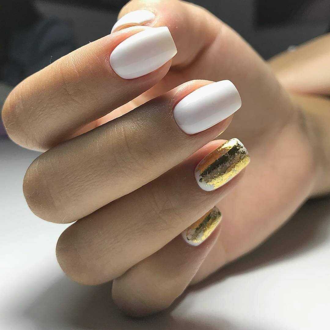 Такой маникюр смотрится сдержанно и лаконично. Необязательно заполнять им весь ноготь полностью, можно нанести золото на свободный край в виде френча или лунного маникюра.