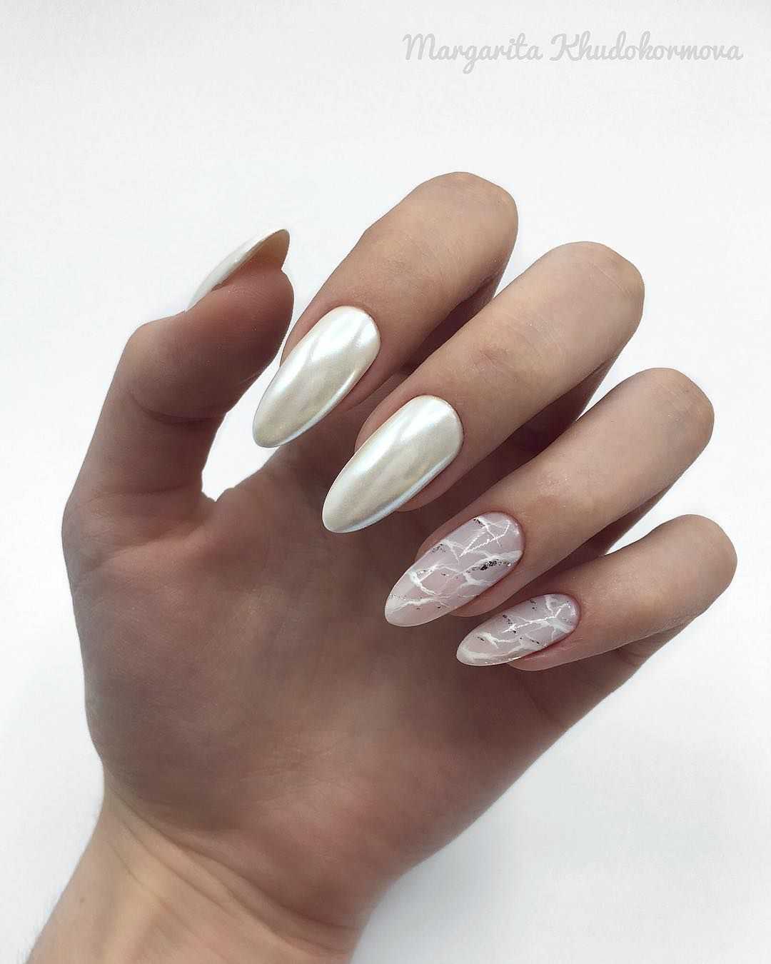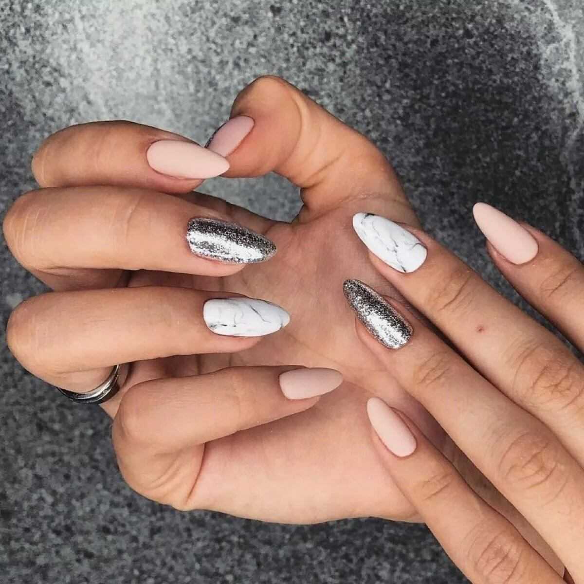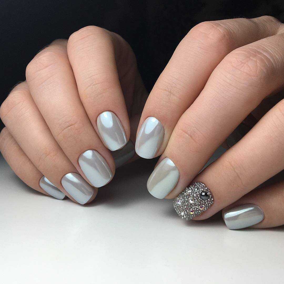 Что касается блестящего декора, то со светлыми тонами “дружат” практически весь представленный в нейл-индустрии материал. Одно из самых удачных сочетаний – это светлые тона и серебряный глиттер. Такой тандем не претендует на эффектный и вызывающий вид, при этом выглядит невероятно нежно и женственно.