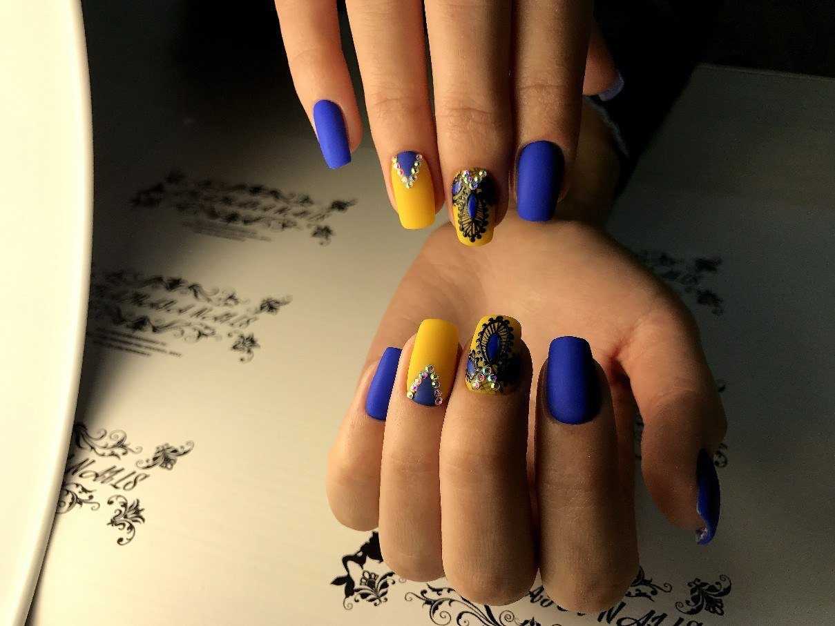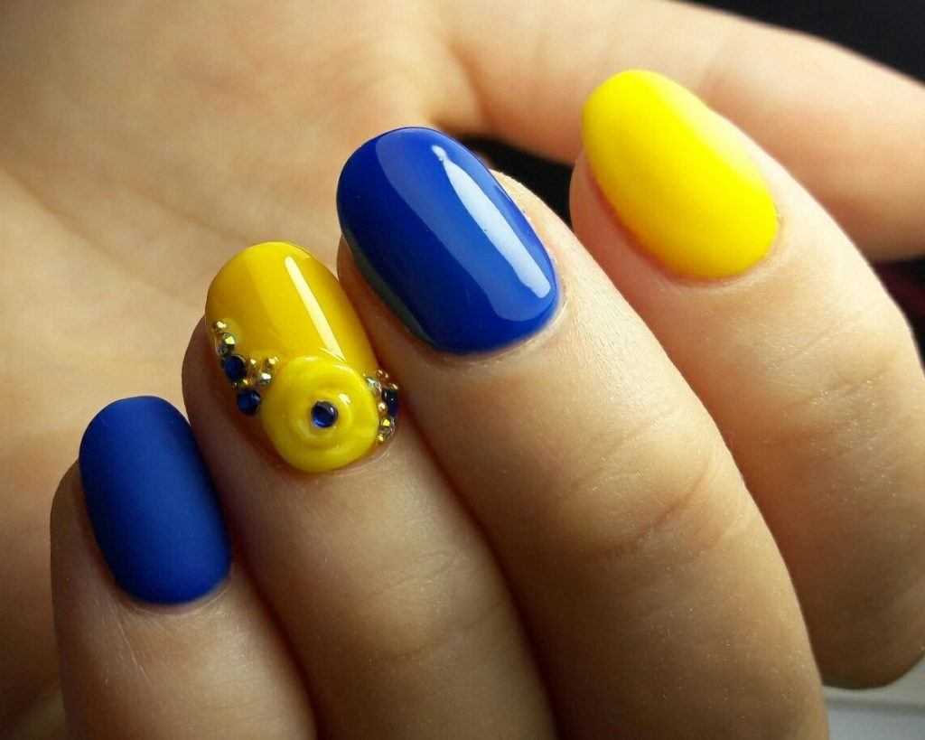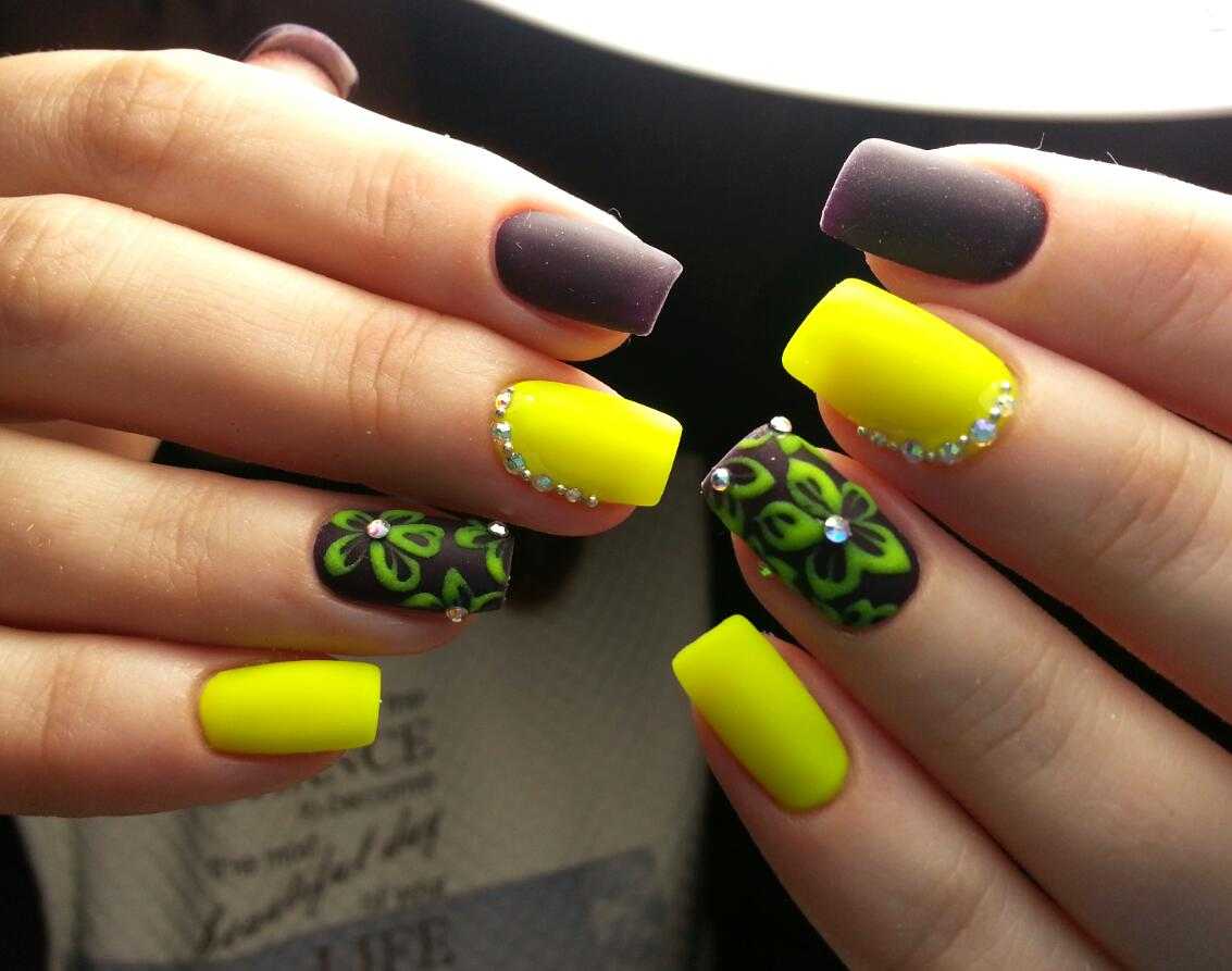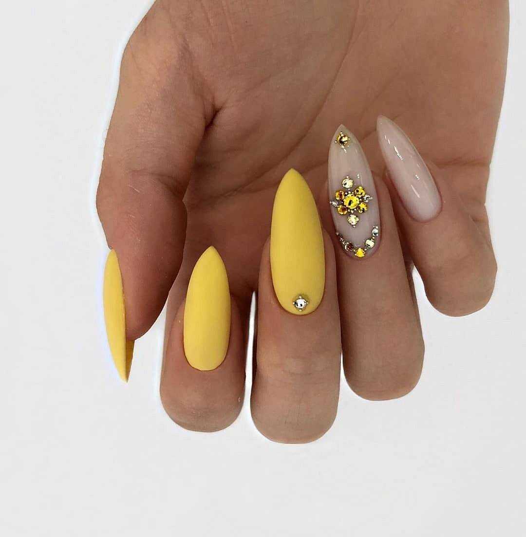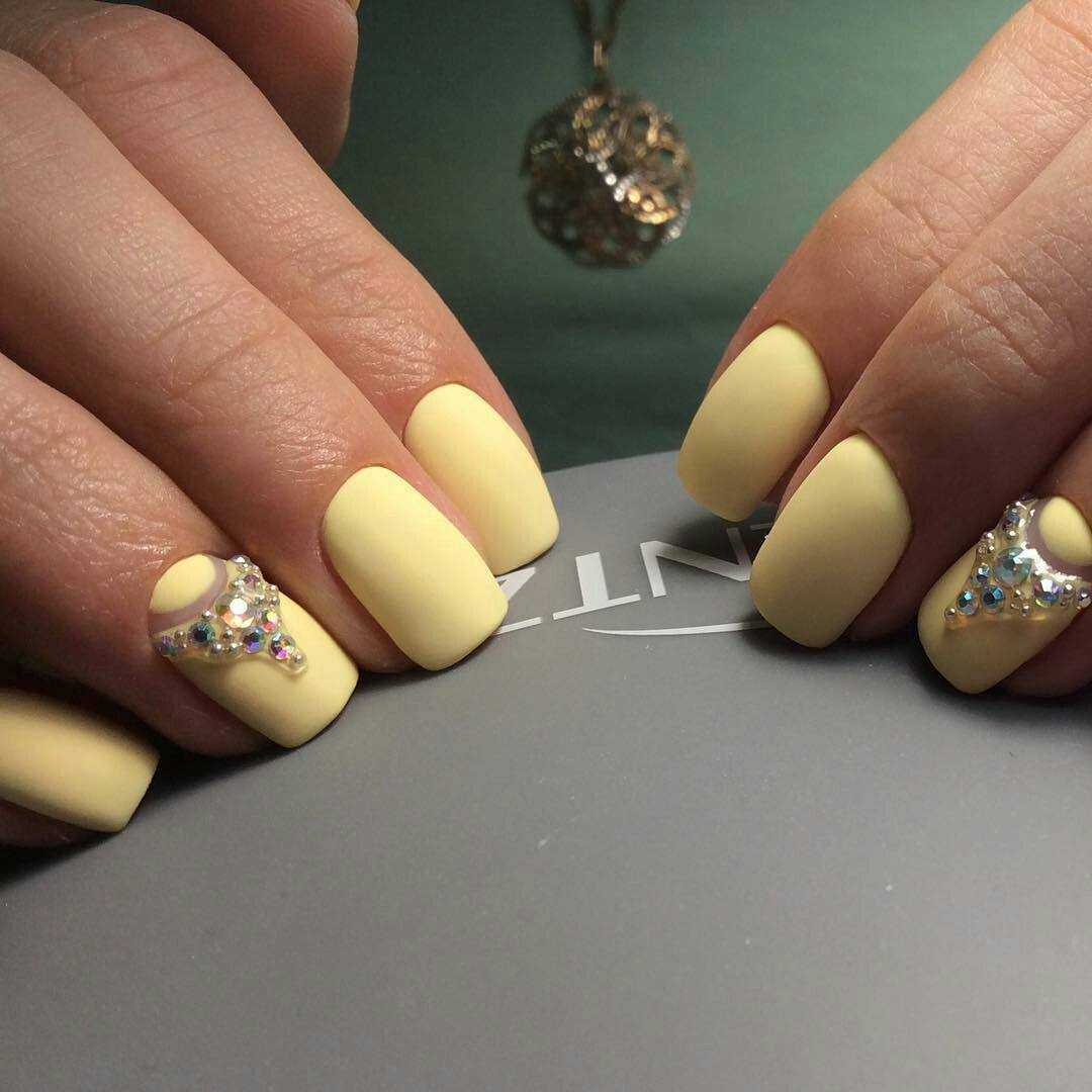 Несмотря на популярность глянцевого покрытия, матовая фактура лака придает маникюру особой роскоши. Даже в желтом цвете он получается более элегантным, сдержанным. Поэтому в некоторых случаях подходит и для вечерних мероприятий. В сочетании с россыпью блесток и страз маникюр будет идеальным, современным. Матовое покрытие хорошо сочетается с дизайном разного цвета и размера. Преимущественно речь идет об абстракции, которая не имеет ограничений в процессе создания. Даже в домашних условиях можно получить достойное оформление без больших затрат времени и материалов.