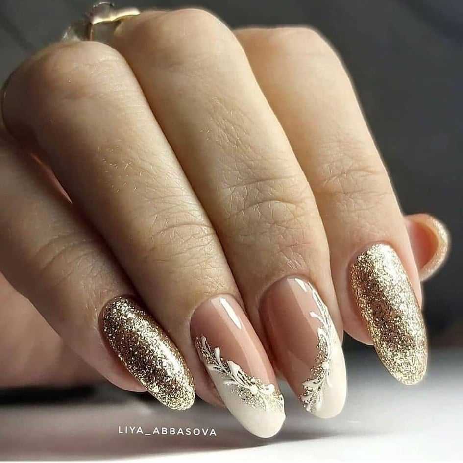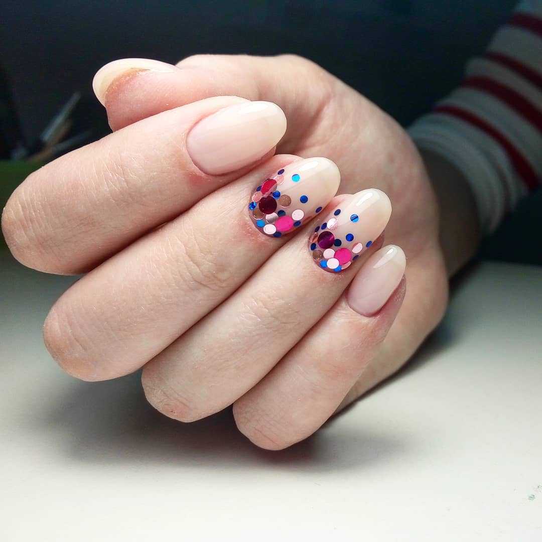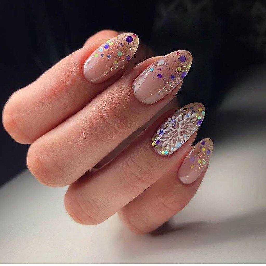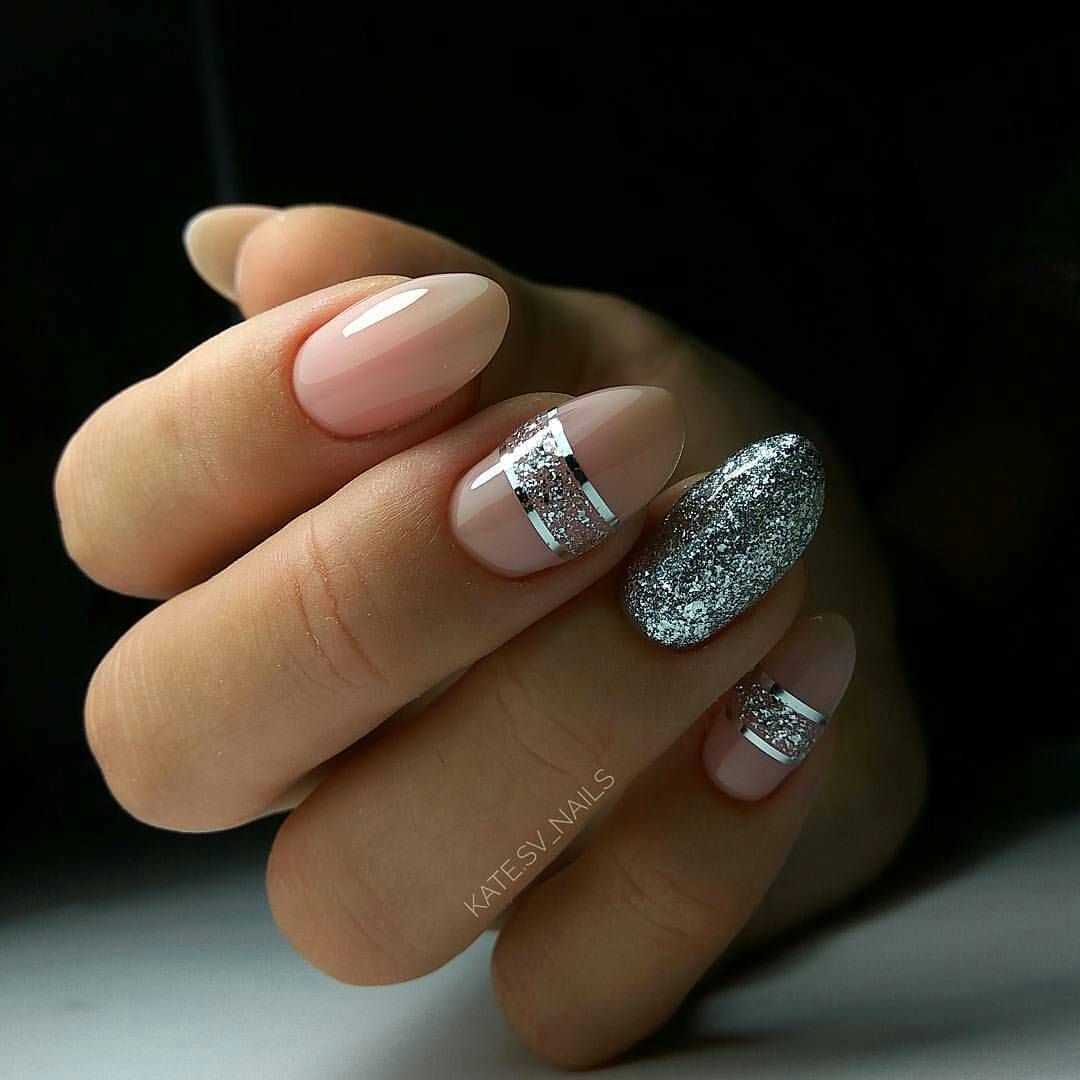 #2 Нюдовый маникюр с блестками на миндальные ногти