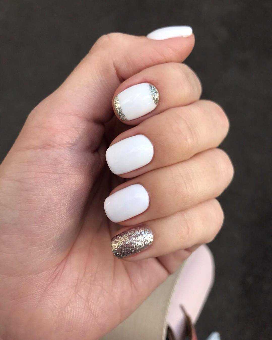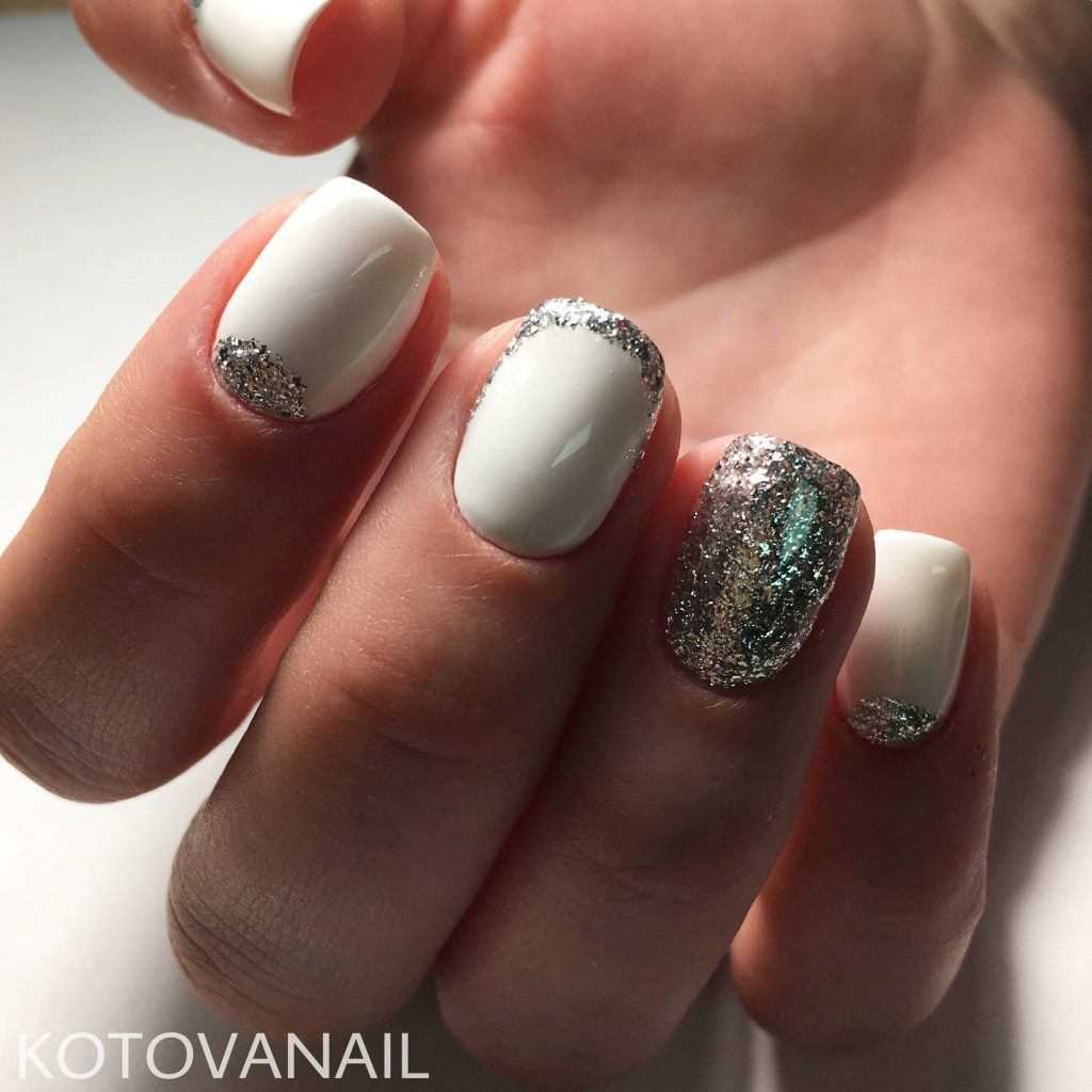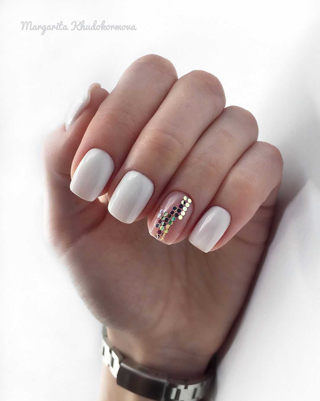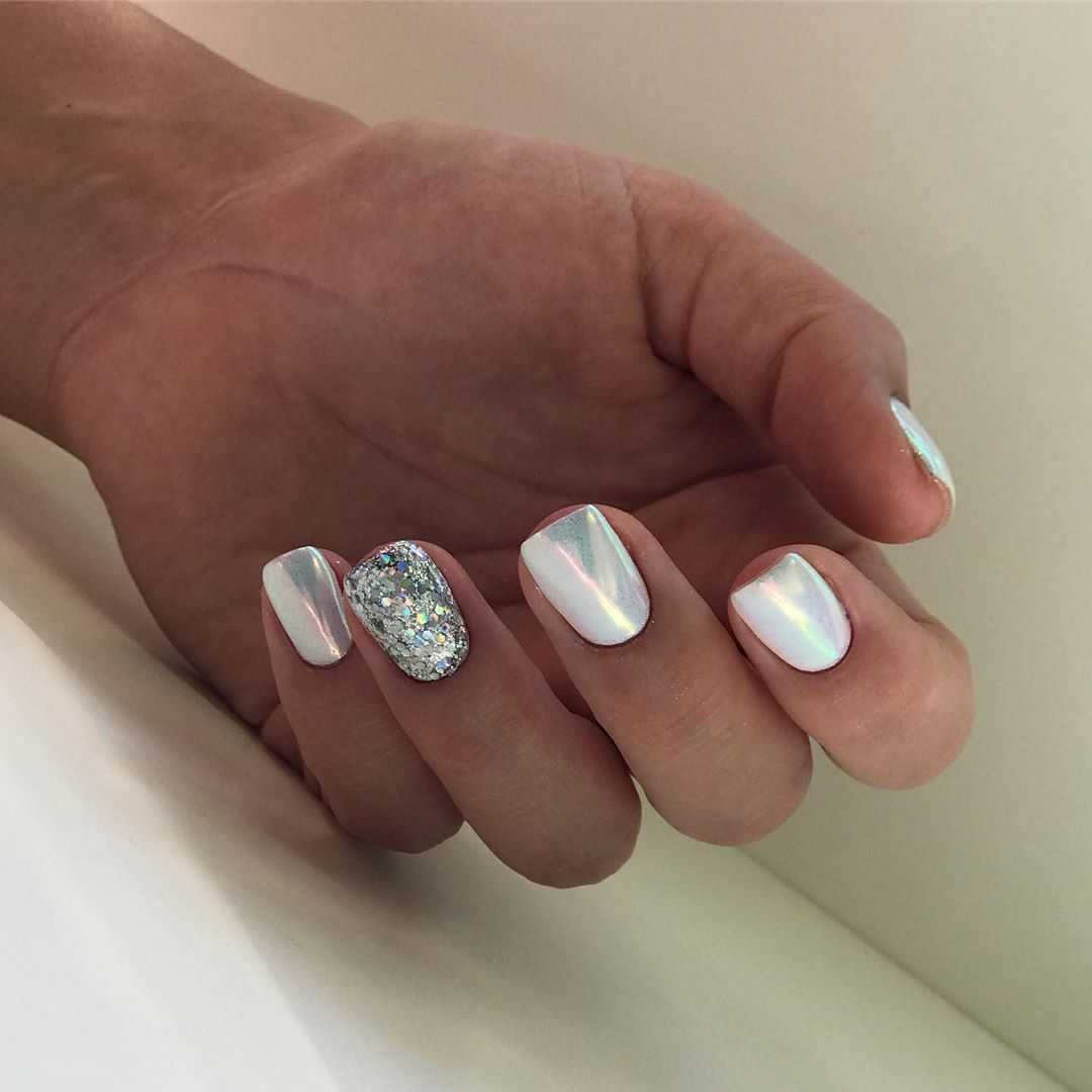 Трендовые идеи молочного маникюра с блестящими частицами на короткие ноготки