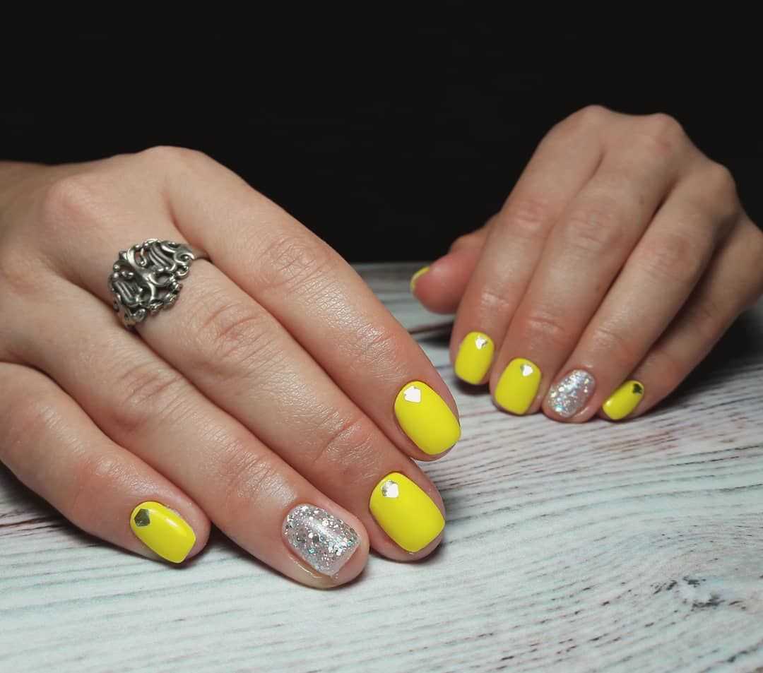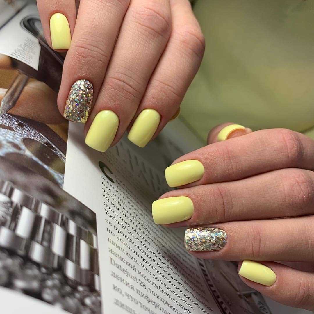 Несмотря на непревзойденную красоту и преимущества длинных ногтей, все большую популярность продолжают приобретать более удобные в повседневной жизни короткие ногти. И уже давно короткая длина ногтей не является препятствием для покрытия их в ярких актуальных цветах со смелыми и блестящими идеями дизайна. Не исключение и модный желтый цвет с блестками. Кстати, блестки с легкостью превращают повседневный солнечно-желтый маникюр на короткой длине ногтей в торжественный.