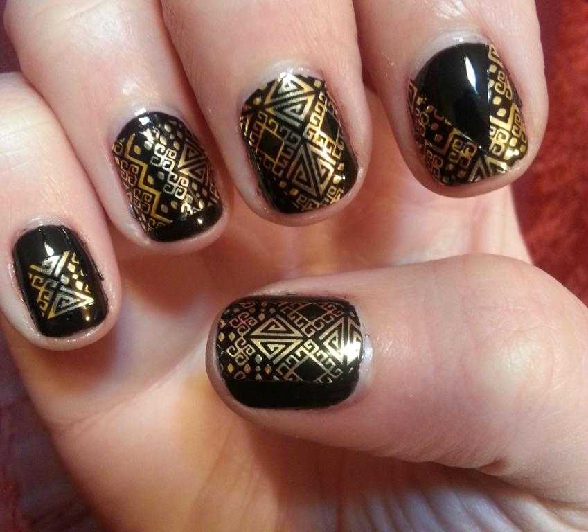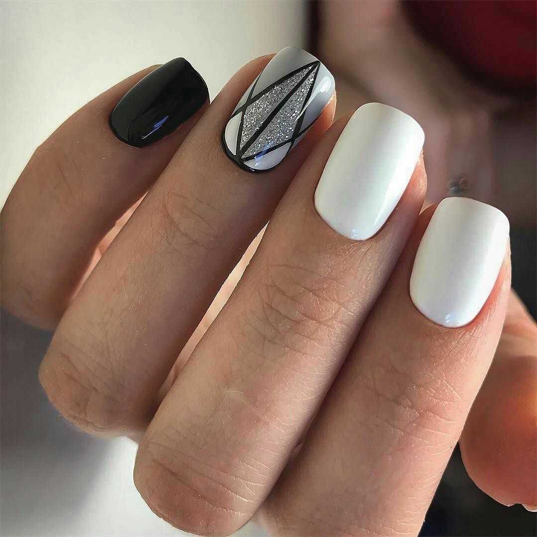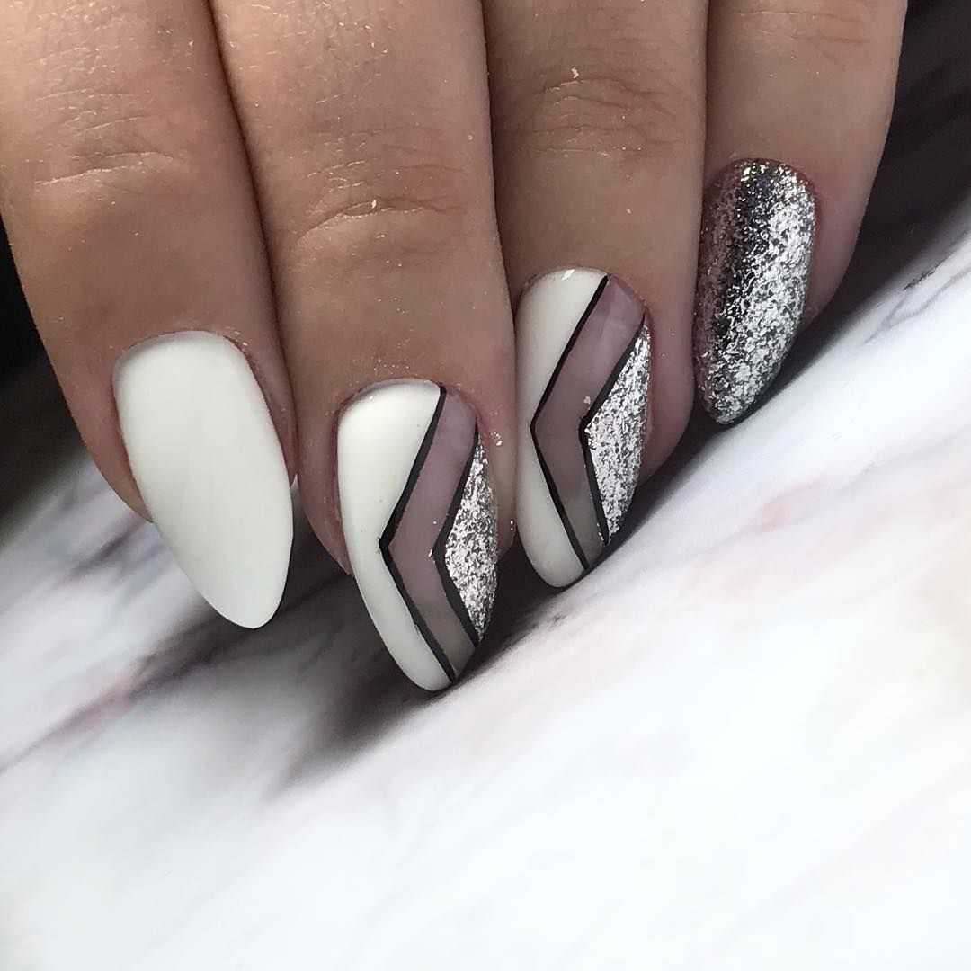 В 2020 году стоит присмотреться к геометрическому дизайну. Тонкие линии, фигуры и точки – все это можно использовать для создания бесчисленного количества рисунков на любой вкус. К тому же, многое зависит от техники нанесения. В домашних условиях использовать кисти не всегда удобно. Выбирайте стемпинг для симметричности. С помощью блесток можно подчеркнуть одну-две линии, что сделает дизайн чуть более ярким.