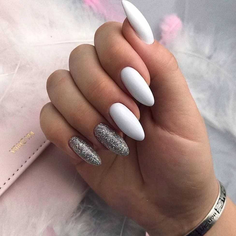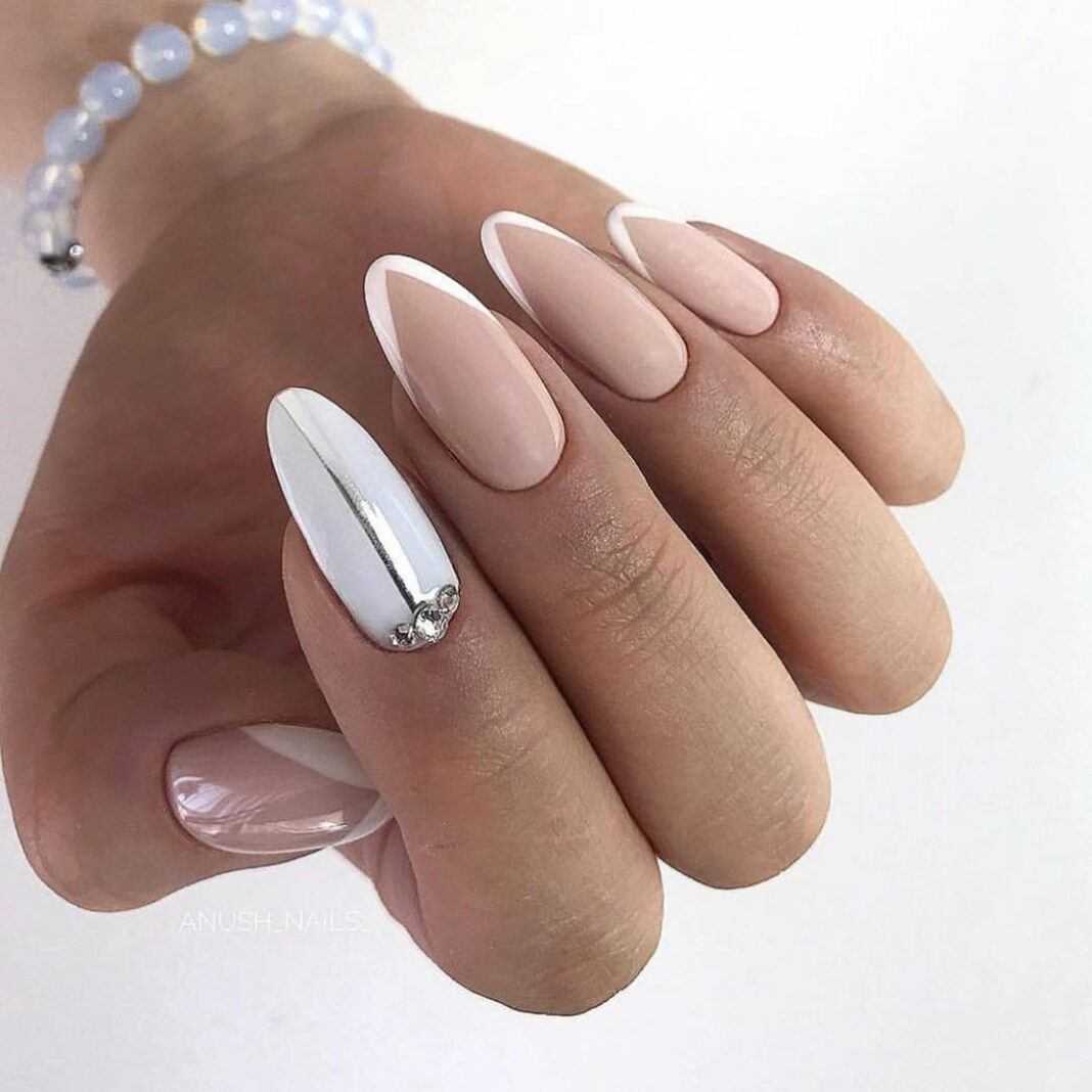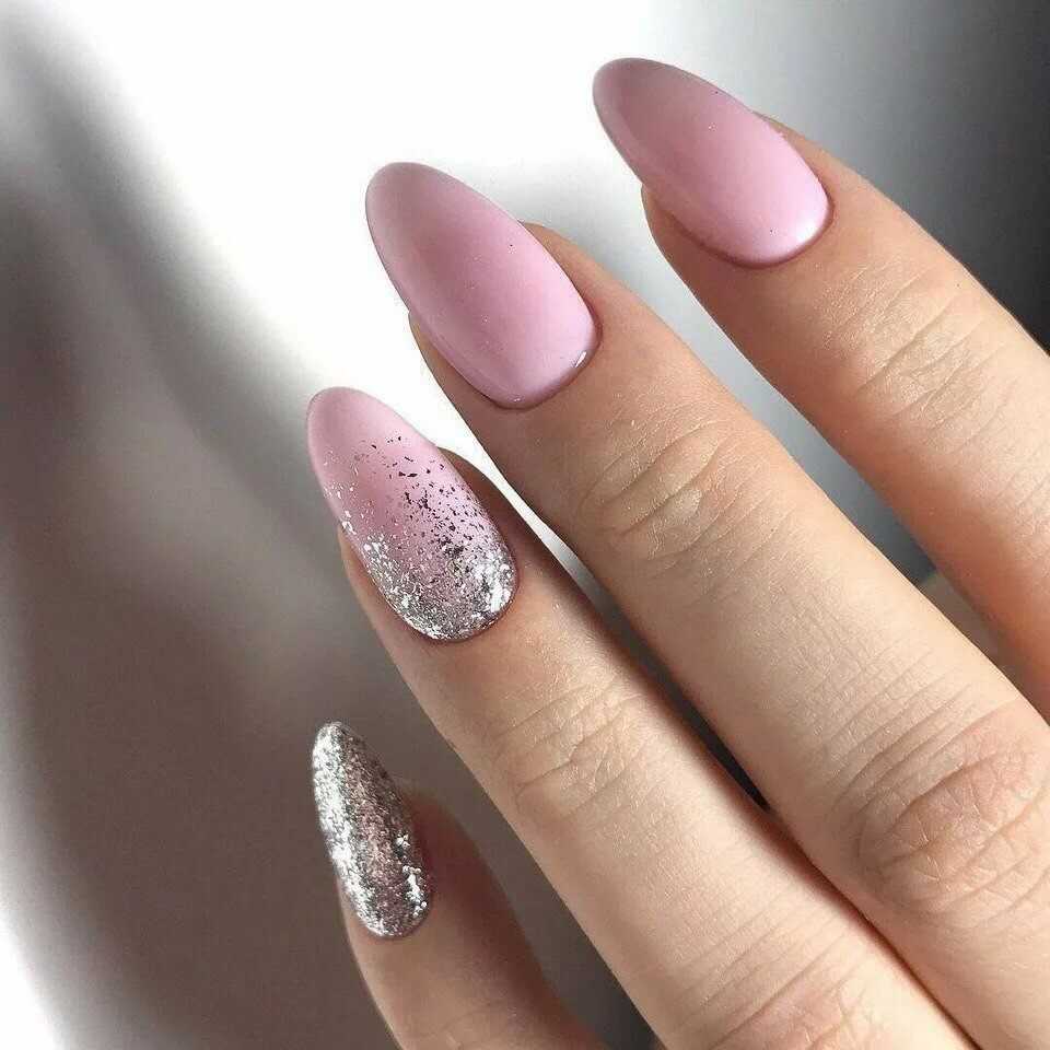 В тренде однотонное покрытие, дизайн с растяжкой блестками, французский и лунный маникюр, дизайн с блестками и стразами. На миндальной форме красиво смотрится дизайн с фольгированными лентами. Такой маникюр шикарно смотрится в повседневных и деловых образах, выдает в своей обладательнице утонченную натуру.