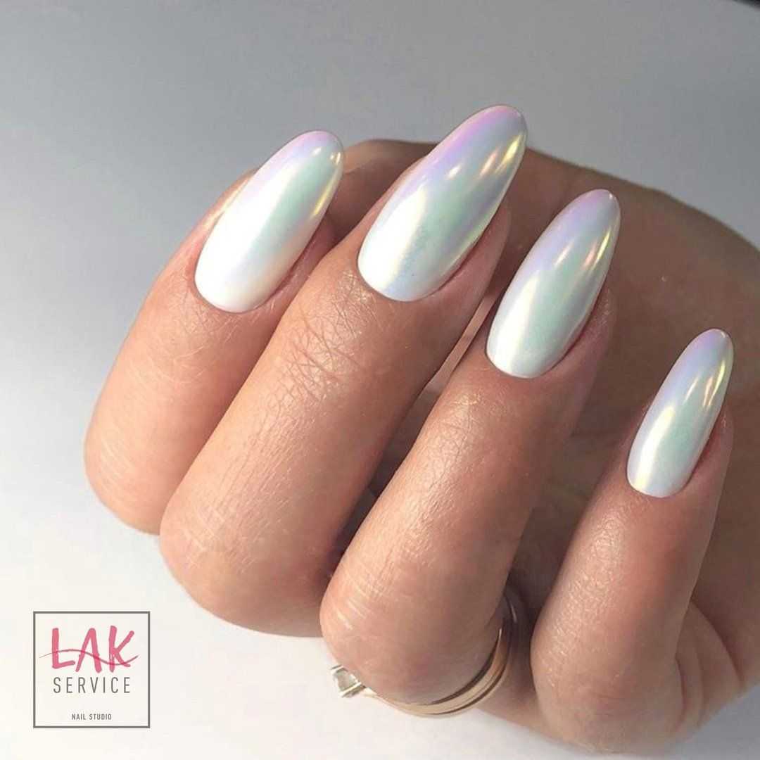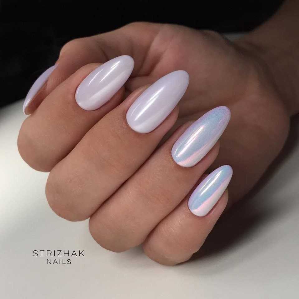 В светлых тонах красиво смотрится втирка. Особенно привлекательно выглядит жемчужная, зеркальная, голографическая втирка в сочетании с белым, нежно-розовым и голубым цветом. К блестящему декору также можно отнести пайетки. Помимо классических круглых пайеток используйте материал в виде звездочек, сердечек, соломки.