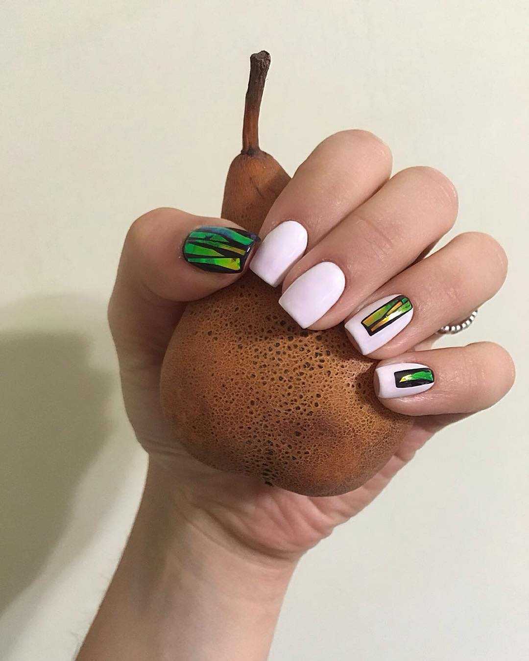 Используя молочную основу в качестве базы, на короткой длине можно выполнить любой дизайн, будь то лаконичное однотонное покрытие с блестящими акцентами в стиле минимализм, нарядный маникюр с элементами флористики или геометрическими фигурами. Не менее привлекательно на коротких ногтях смотрятся и более радикальные решения, например, френч с тёмной улыбкой и блёстками или полное покрытие любым контрастным оттенком нескольких ноготков. Удивлены? И это только некоторые из возможных видов оформления.