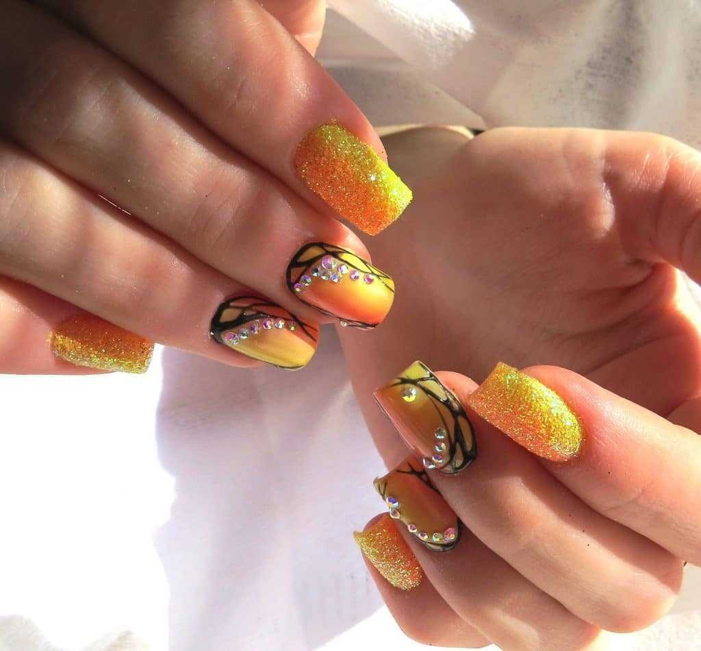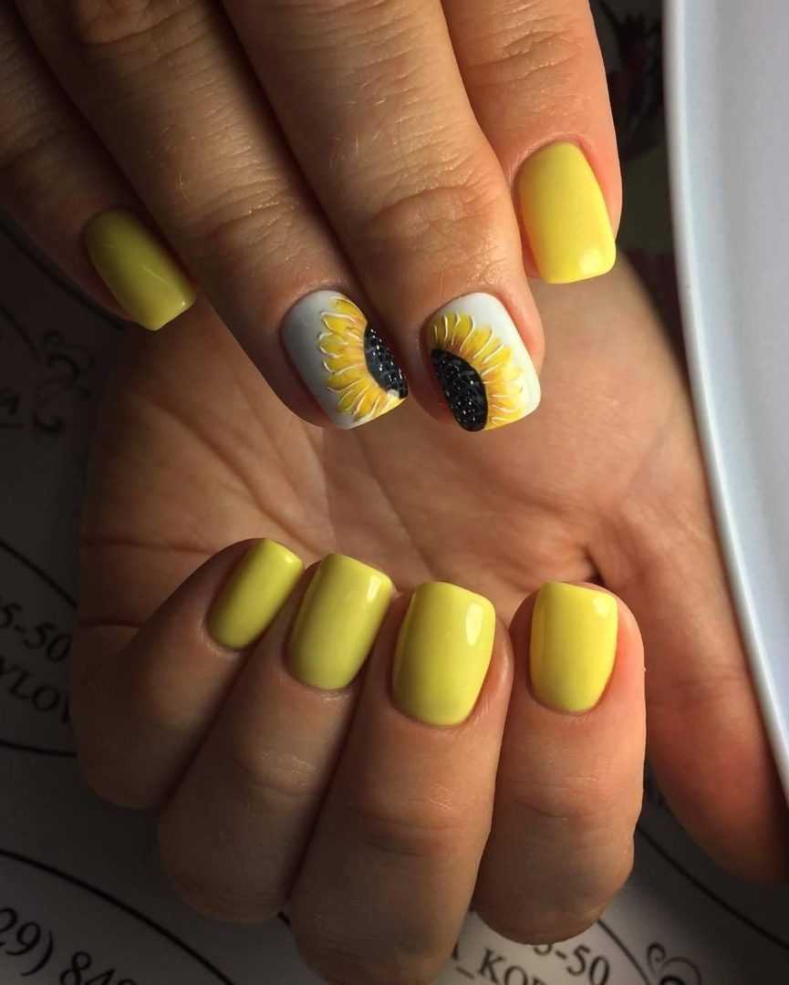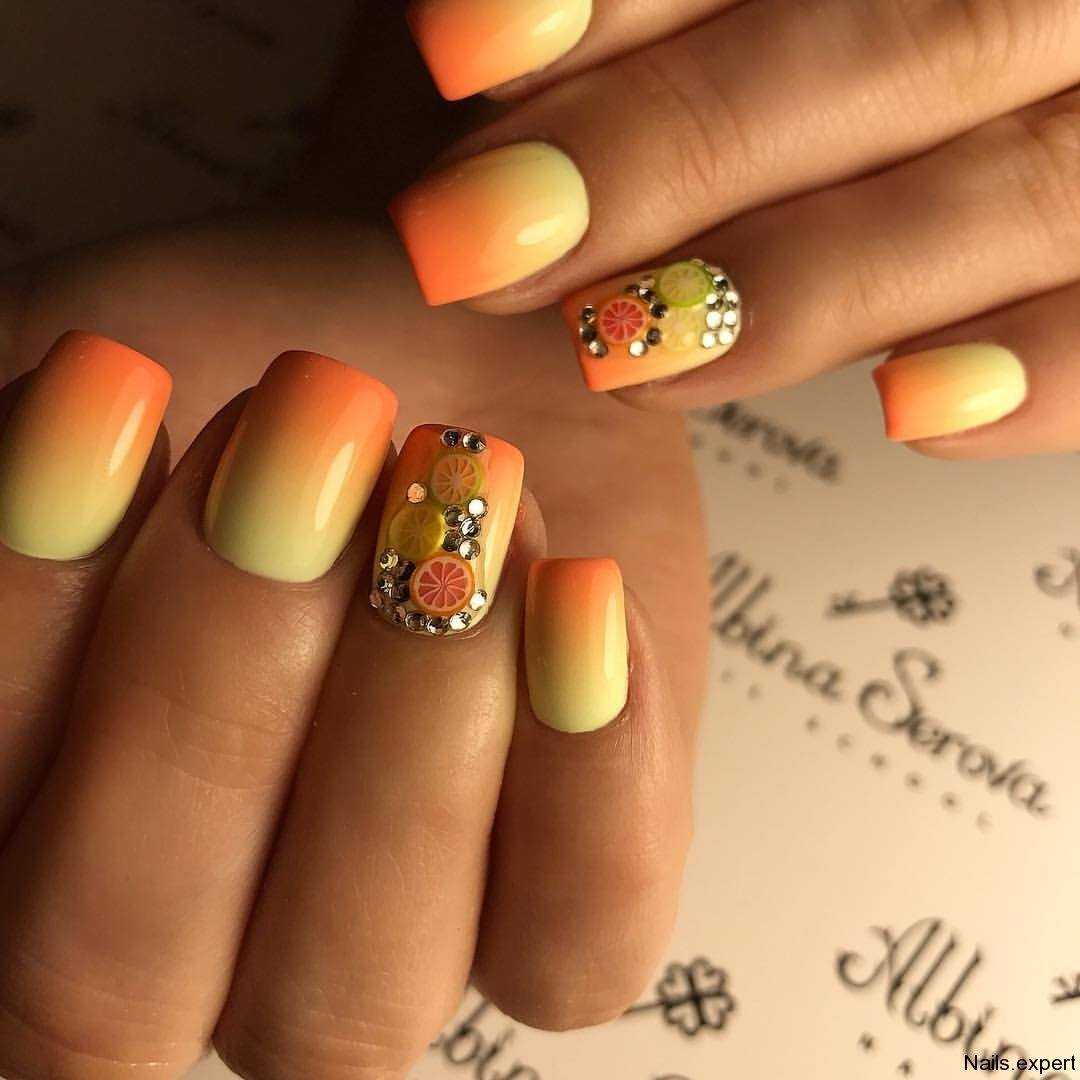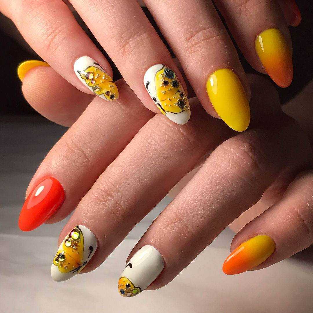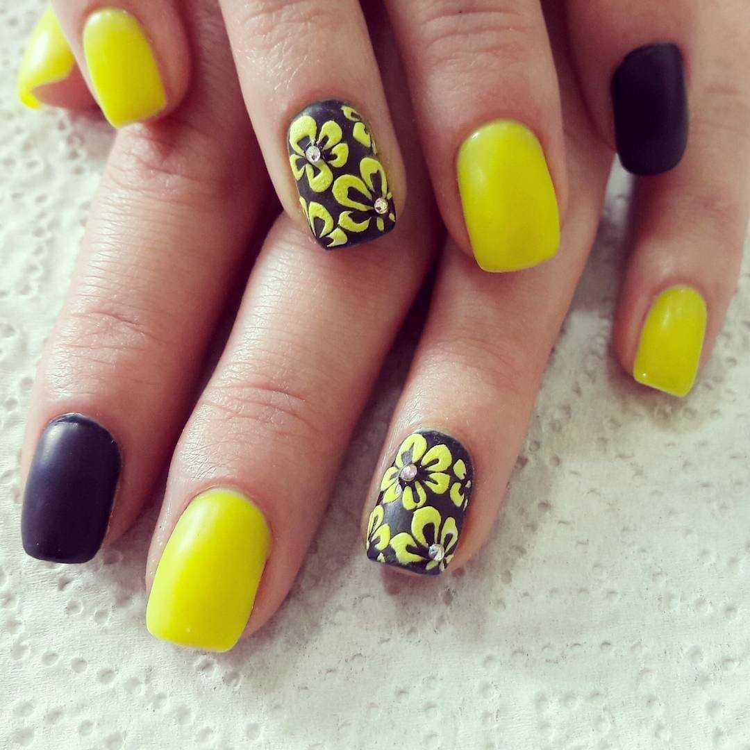 Достаточно необычным и удобным решением для маникюра на коротких ногтях станет градиент желтого с белым, зеленым, оранжевым цветом. Градиент самодостаточен, но может быть, по Вашему желанию дополнен дизайном из блесток или небольшими капельками из камней. Также возможно шикарное украшение ногтей насекомыми или желтым цветочным принтом небольшого формата, тогда как для длинных ногтей это могут быть крупные желтые цветы: тюльпаны, ромашки, розы.
