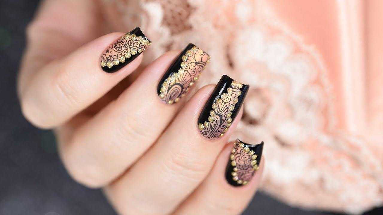 - стемпинг – самый простой и удобный способ создания любых узоров на ногтях. Вам потребуется специальный набор для стемпинга, который включает пластину с узорами, скребок и штампик. Перенесите понравившийся ажурный рисунок на ногти, при этом можно использовать любой цвет в качестве фона.