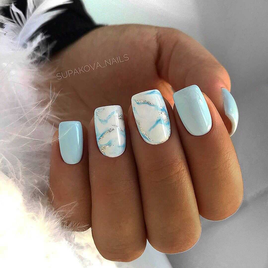Шикарно выглядит дизайн с акриловой пудрой, с кружевным декором, морской тематикой. Бело-голубой маникюр великолепно смотрится на коротких ногтях, иногда даже лучше, чем на длинных. Используйте однотонное покрытие, дизайн с точками, морской волной, изображением морских обитателей.