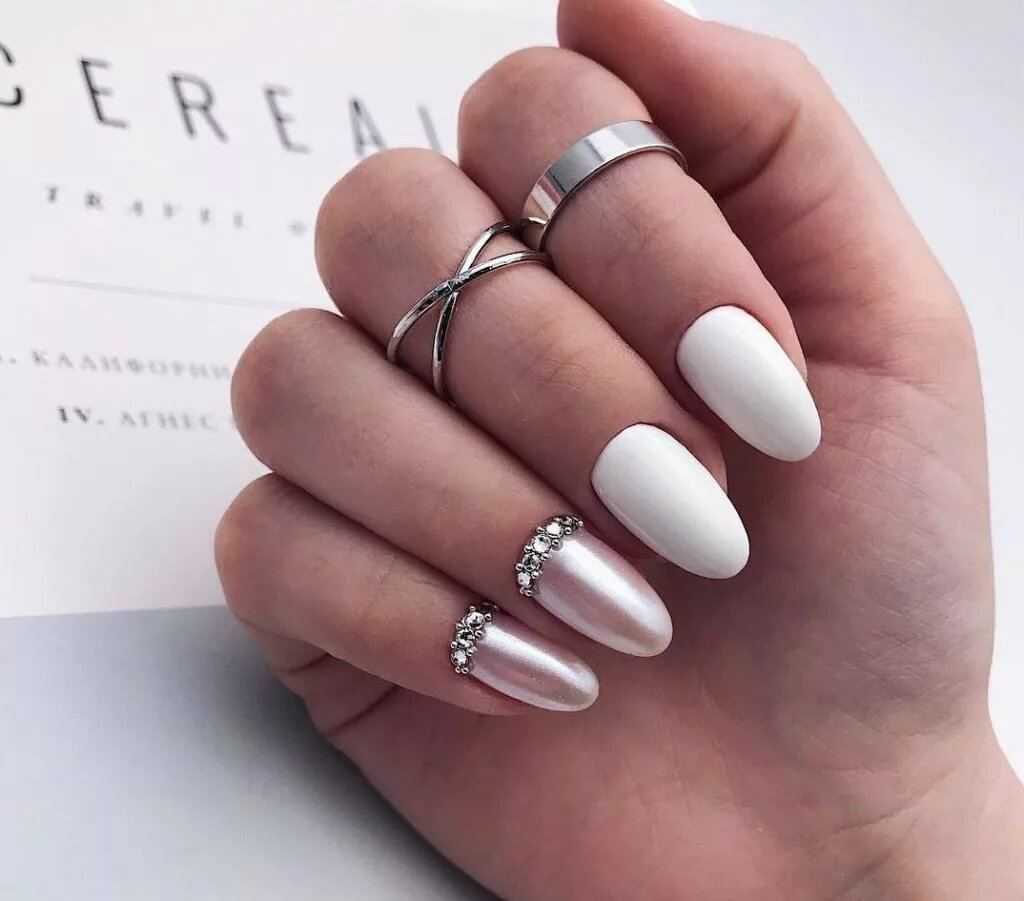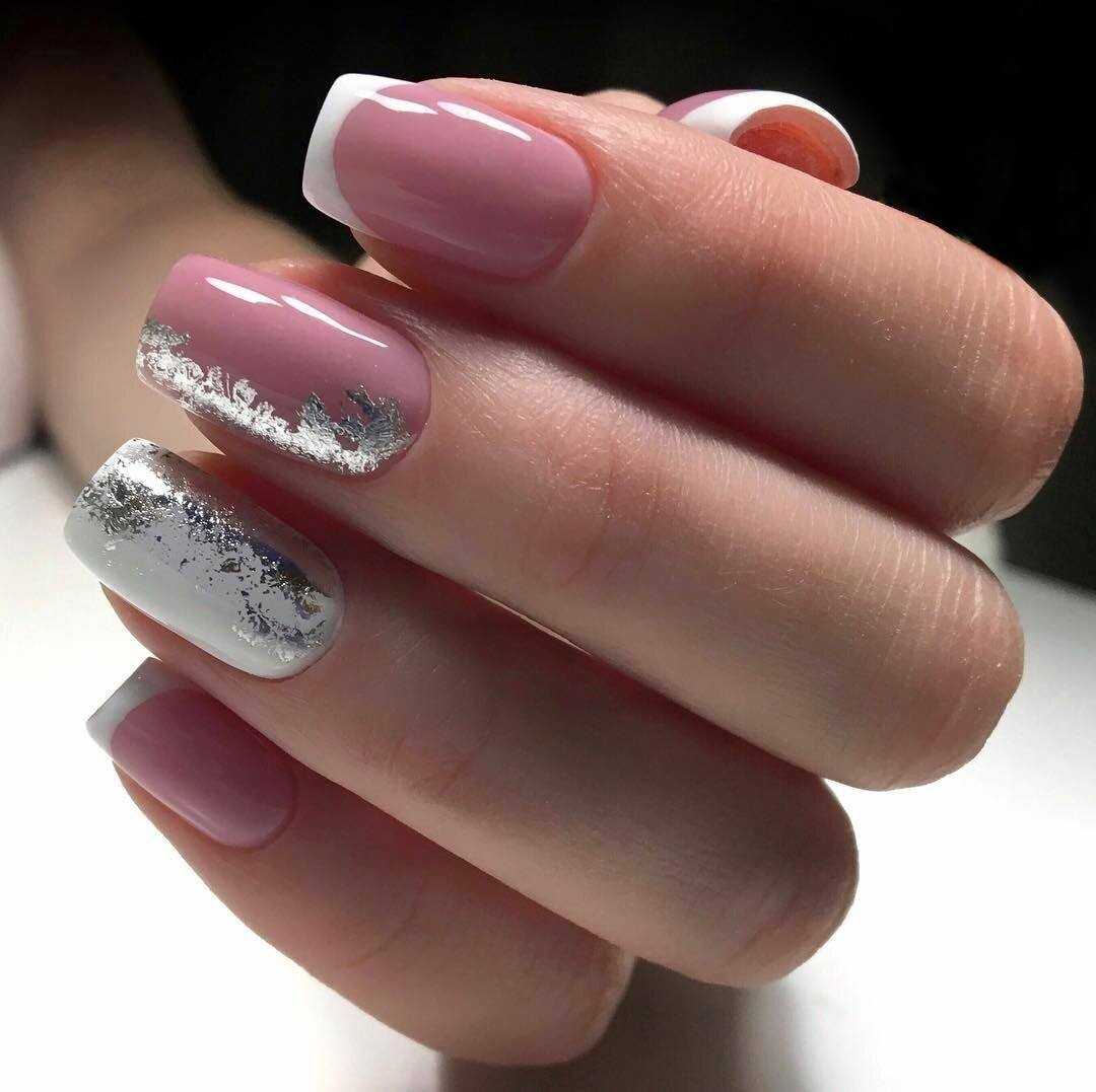 Не ограничивайтесь только однотонными нейл-артами. Добавьте в дизайн кружевной узор, выделите прикорневую зону. Используйте в качестве дополнения розовый цвет. Сочетание белого, розового и серебряного оттенков смотрится на ногтях благородно и очень сдержанно. Пример такого нейл-арта вы можете видеть на фото ниже.