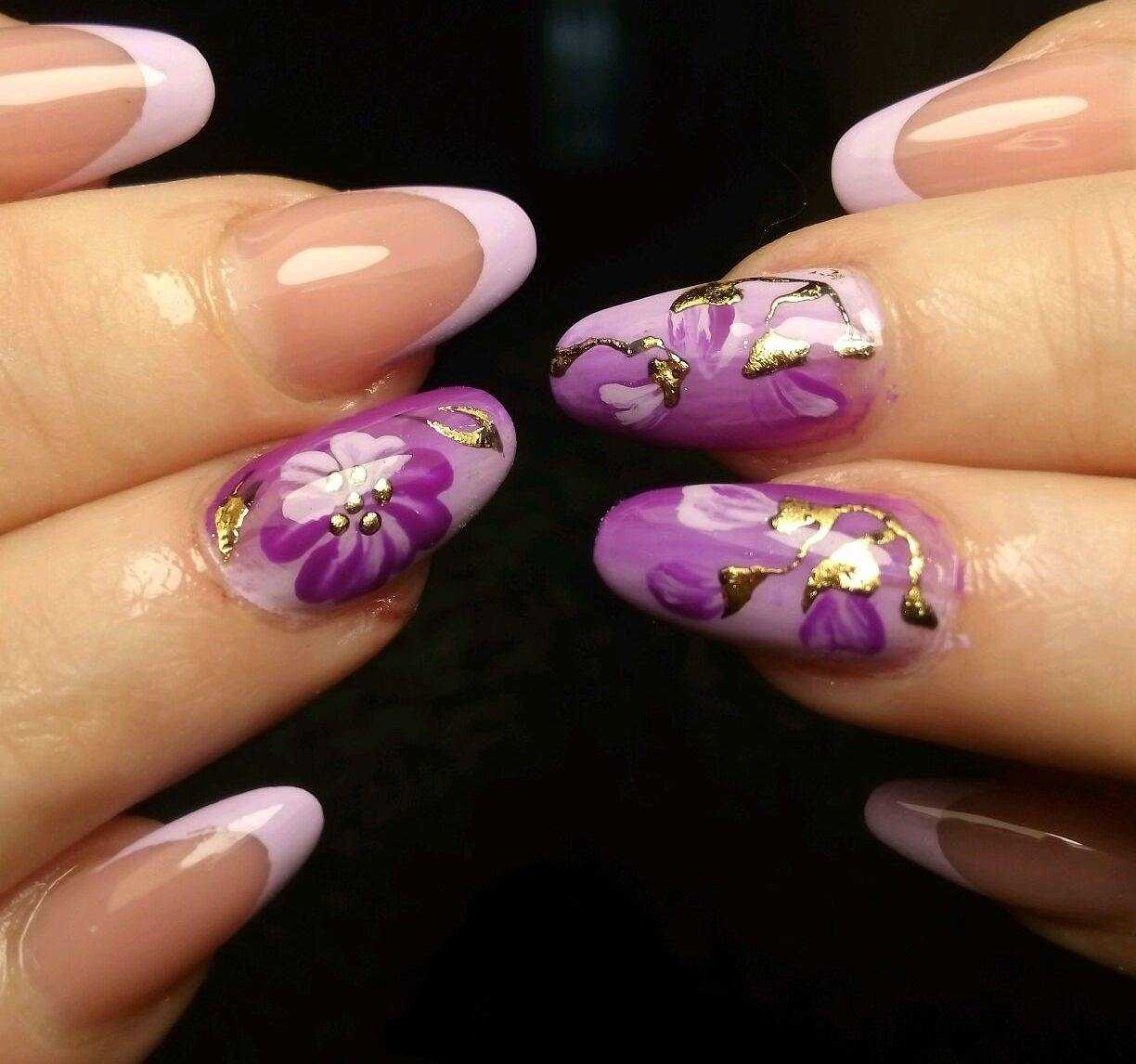Маникюр во французском стиле можно уверенно назвать одной из самых популярных идей оформления, ведь сдержанность и элегантность френча просто чудесно сочетается со всевозможными цветочными мотивами. Рисунки в этом случае словно преображают дизайн, позволяют модницам проявить фантазию и создать неповторимый шедевр. Актуальное расположение цветов или веточек – безымянный палец. Хотя при желании можно украсить узорами все ноготки. Если рисунок наносится на акцентный ноготок, то в качестве подложки используется один из тонов лака, который принимает участие в оформлении или белый, если вид маникюра соответствует классике. При нанесении узоров на все ноготки их принято располагать по линии улыбки. Крупные блёстки можно использовать для выделения сердцевины соцветий. Мелкие частицы очень красиво украсят полоску френча либо детали изображения.