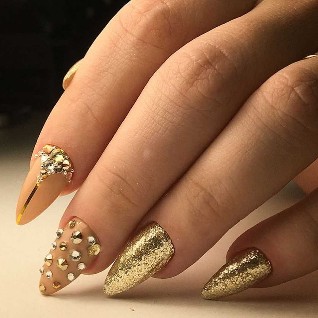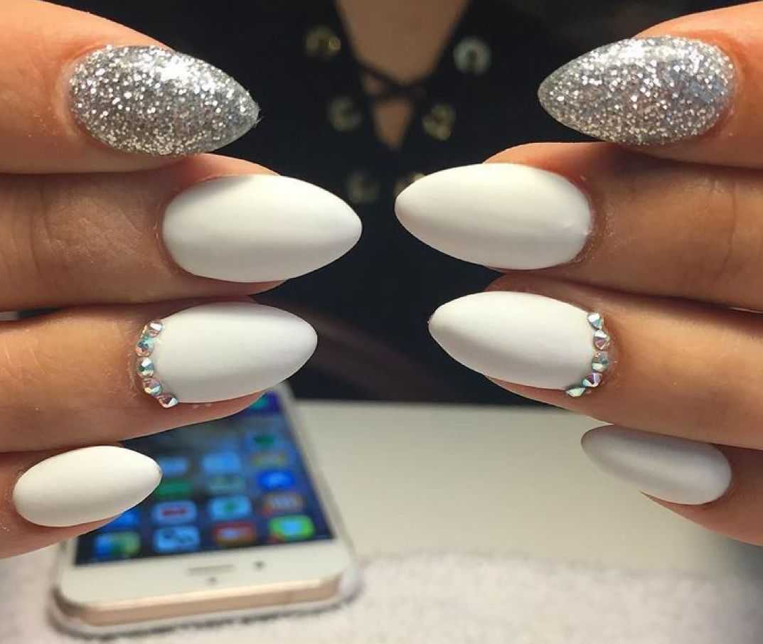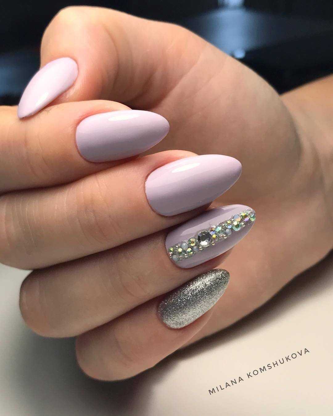 На миндальных ногтях рекомендуется выполнять минималистичный декор блестками и стразами. Присмотритесь к нейл-артам с полосками, выложенным из стразов или украшенным глиттером. Интересно смотрится лунный маникюр с глиттером в прикорневой зоне.