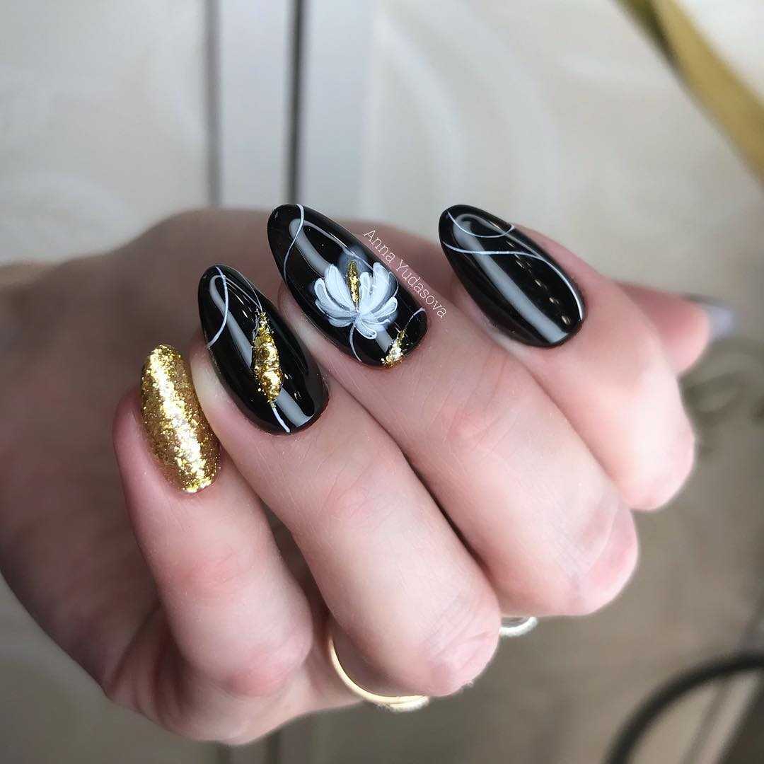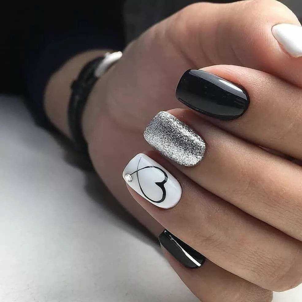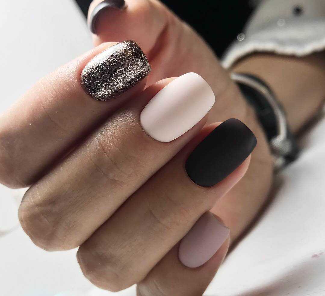 Иногда, чтоб сиять и восхищать своим внешним видом, достаточно просто выполнить подходящий дизайн маникюра. Одним из таких нейл-артов считается черный маникюр с дополнением блесток. В основном такой дизайн украшают декором серебристого или золотистого цвета. Данный тандем выглядит элегантно и обаятельно на ноготках любой длины. Невероятно и восхитительно смотрится и все ноготки, покрытые черными блестками. Такой дизайн наиболее уместен для праздничных и вечерних выходов в сочетании с соответствующими нарядами. Выполните блестящую луночку у основания ноготка на матовой основе, и маникюр приобретет строгий вид.