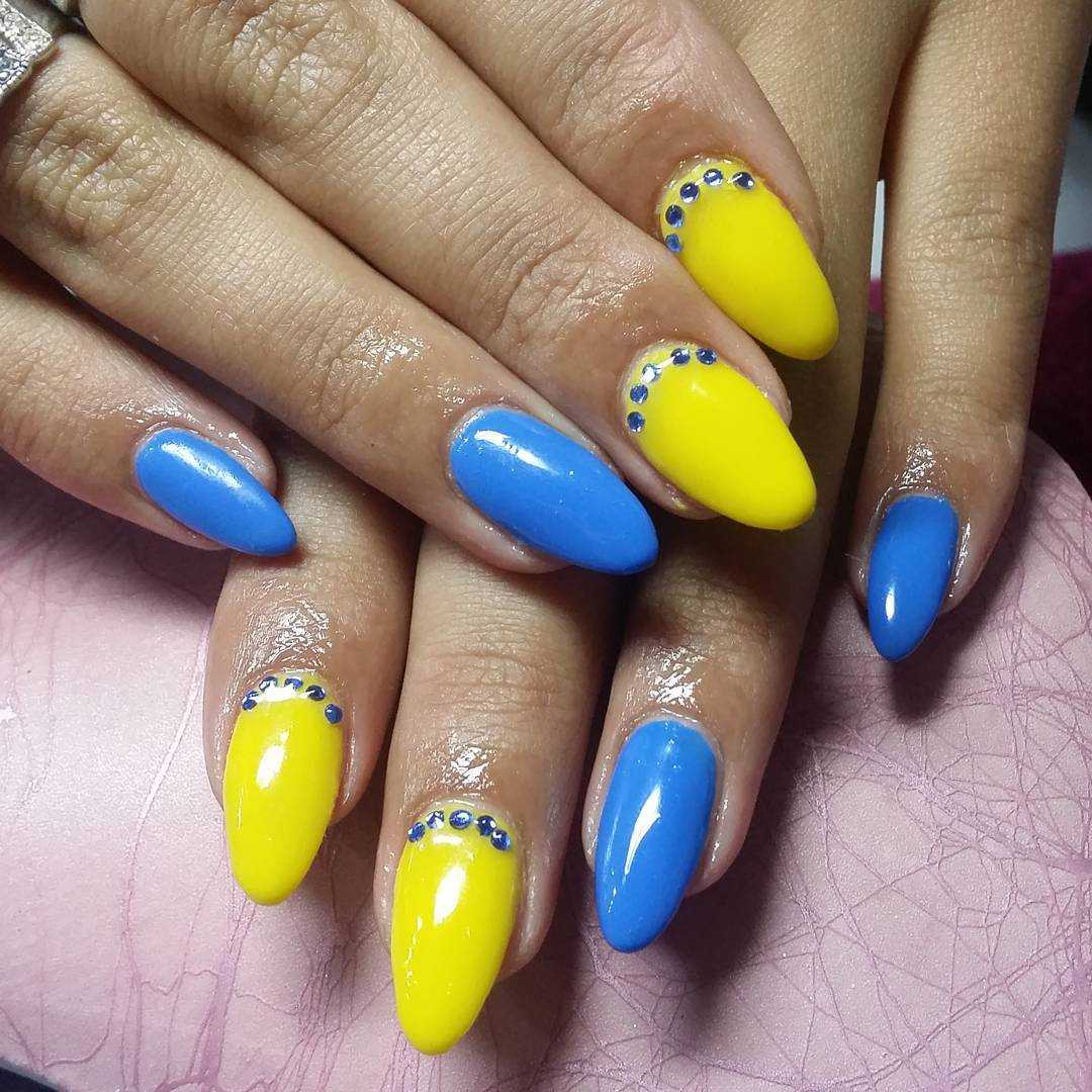 Для такого маникюра рекомендуется использовать более яркие и привлекающие внимание оттенки желтого, чтобы неокрашенный участок выделялся более отчетливо. Также его можно украсить камнями, стразами или фольгой