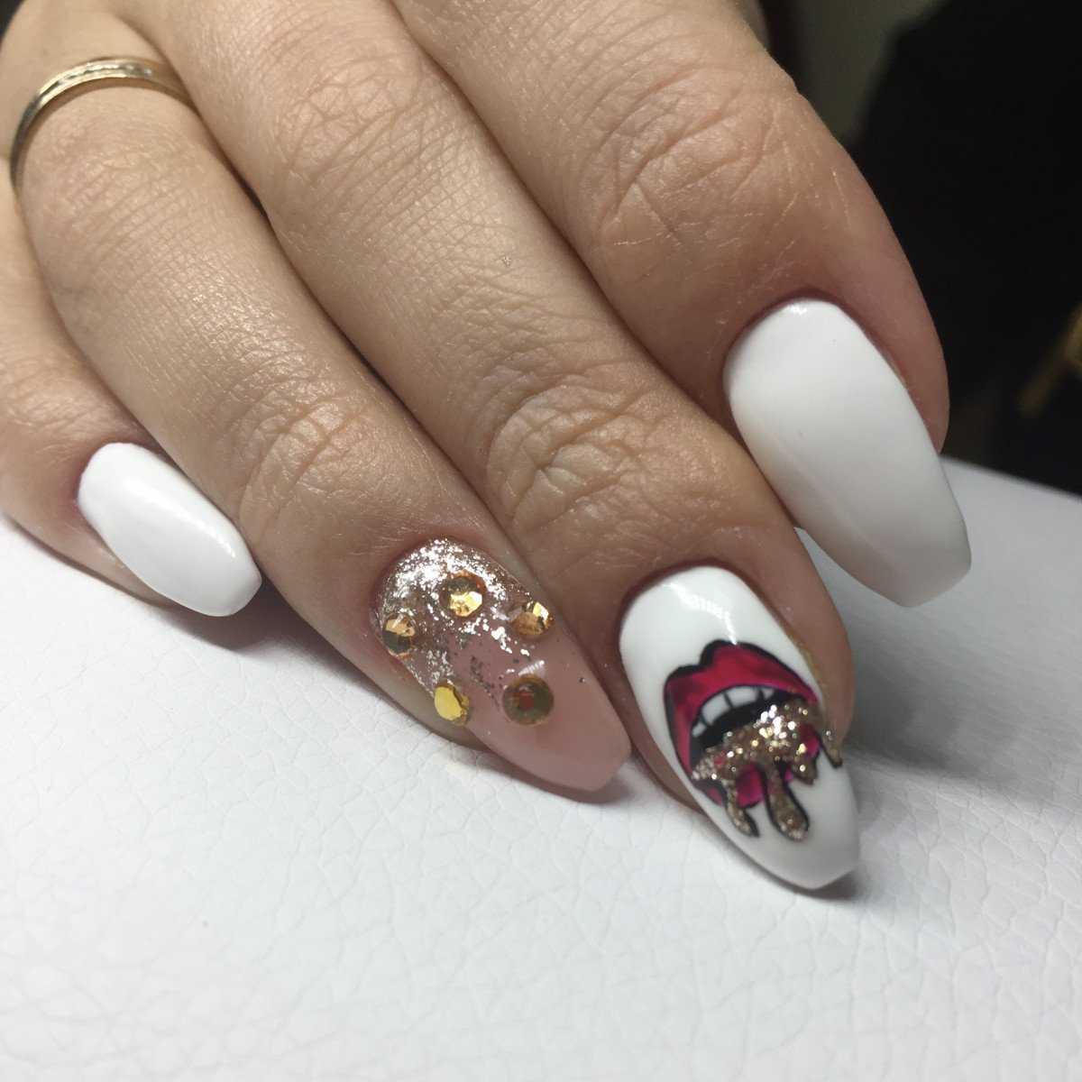 Лунный маникюр возник примерно одновременно с френчем, поэтому данный дизайн смело можно считать классическим и универсальным, ведь они так похожи. Лунный маникюр превосходно выглядит в белом цветовом решении. Разнообразить и сделать интереснее такой маникюр можно при помощи глиттера, страз любого цвета или пудрового напыления. Беспроигрышным и изящным вариантом для любого события считается украшение луночки мелкими блестками. Этот привлекательный и в тоже время ненавязчивый декор придаст дизайну нежное сияние и нотки загадочности. Стоит заметить, что данный стиль не выходит за грань повседневного варианта маникюра.