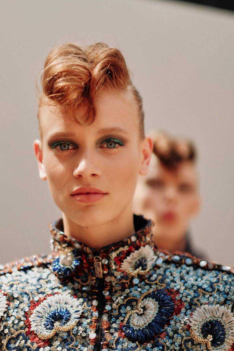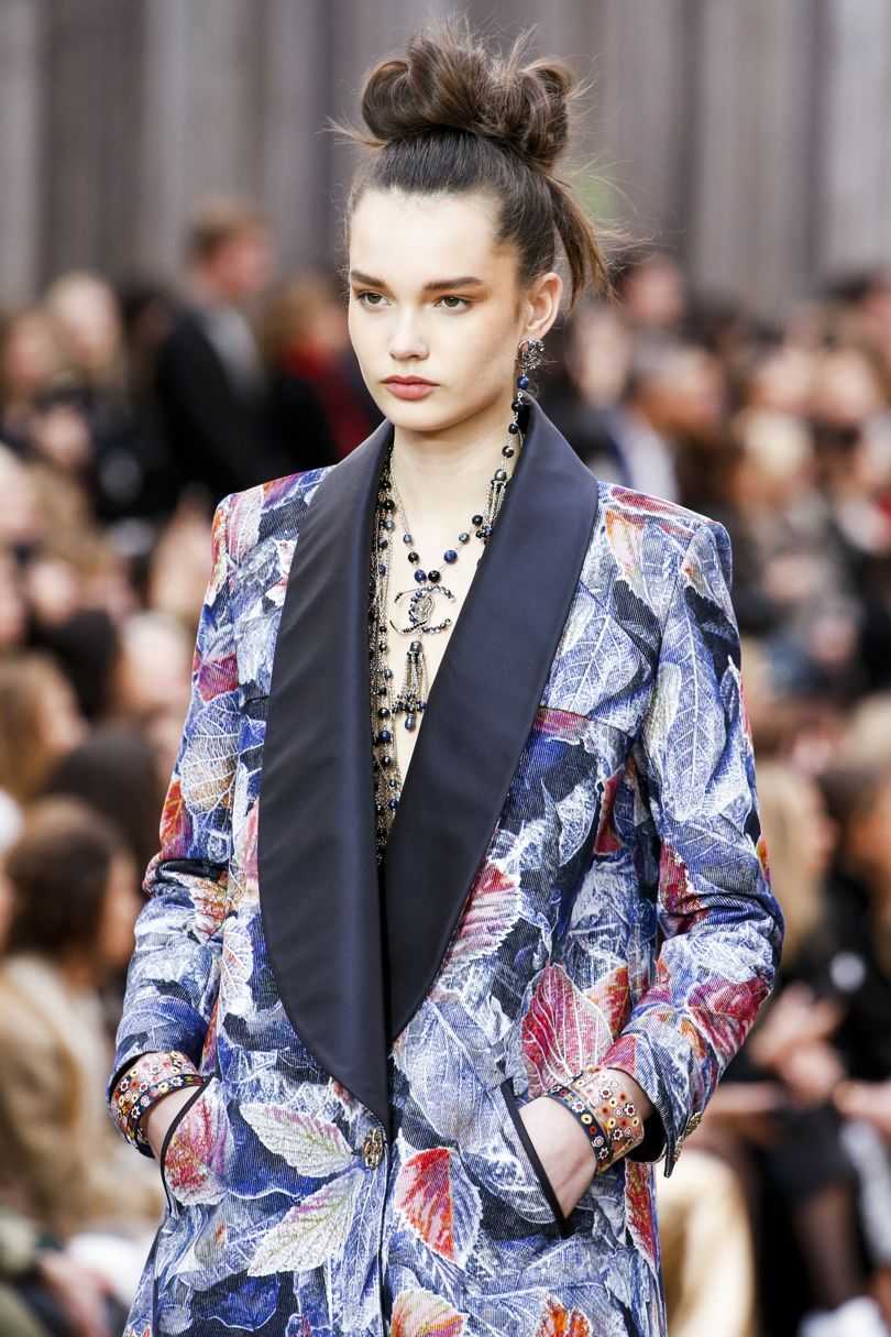 Chanel демонстрирует стильную прическу, идеальную для серьезных бизнес-леди. Локоны уложены безупречно, волосок к волоску, с чётко проработанной линией косого пробора.