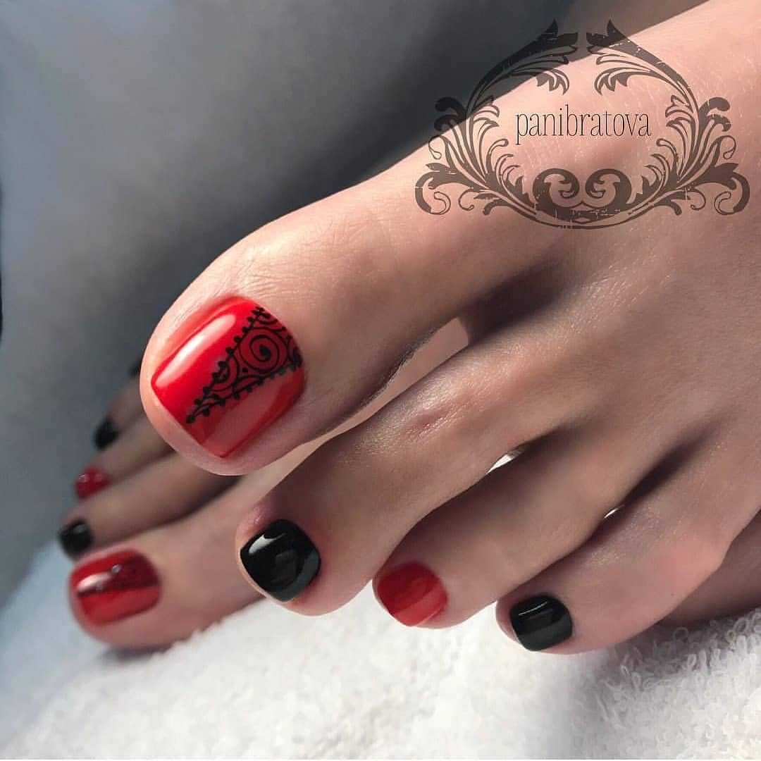 Сочетание черного и красного с успехом используется в маникюре для создания геометрических и других нейл-артов. Тандем этих оттенков действительно выглядит необычно и ярко. Что касается педикюра, то есть несколько вариантов декора ногтей: