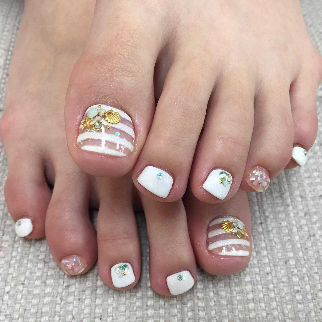 Если рассматривать педикюр с точки зрения летних вариантов, то можно понять, что подиумный педикюр и педикюр модниц из социальных сетей – разные вещи. Многие предложенные идеи достойны особого внимания, в том числе и золотой педикюр. К сожалению, разнообразие в такого рода ногтевом дизайне немножко хромает. Сплошное покрытие золотым лаком выглядит чересчур пафосно и даже скучно. Он уместен не везде и не всегда. При помощи золотой слюды для стеклянного дизайна можно интересно разнообразить золотой педикюр.