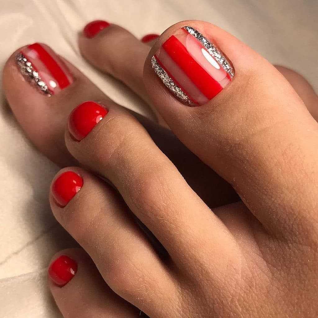 Самым простой и легкий способ разнообразить красный педикюр – это добавить в него блестящий декор. С появлением гель-лаков с глиттером сделать красивый дизайн с блестками стало намного проще. Если правильно расположить сухие блестки было проблематично, то с помощью кисточки с глиттером можно выполнить абсолютно любой узор. Есть несколько вариантов декорирования ногтей блестками: