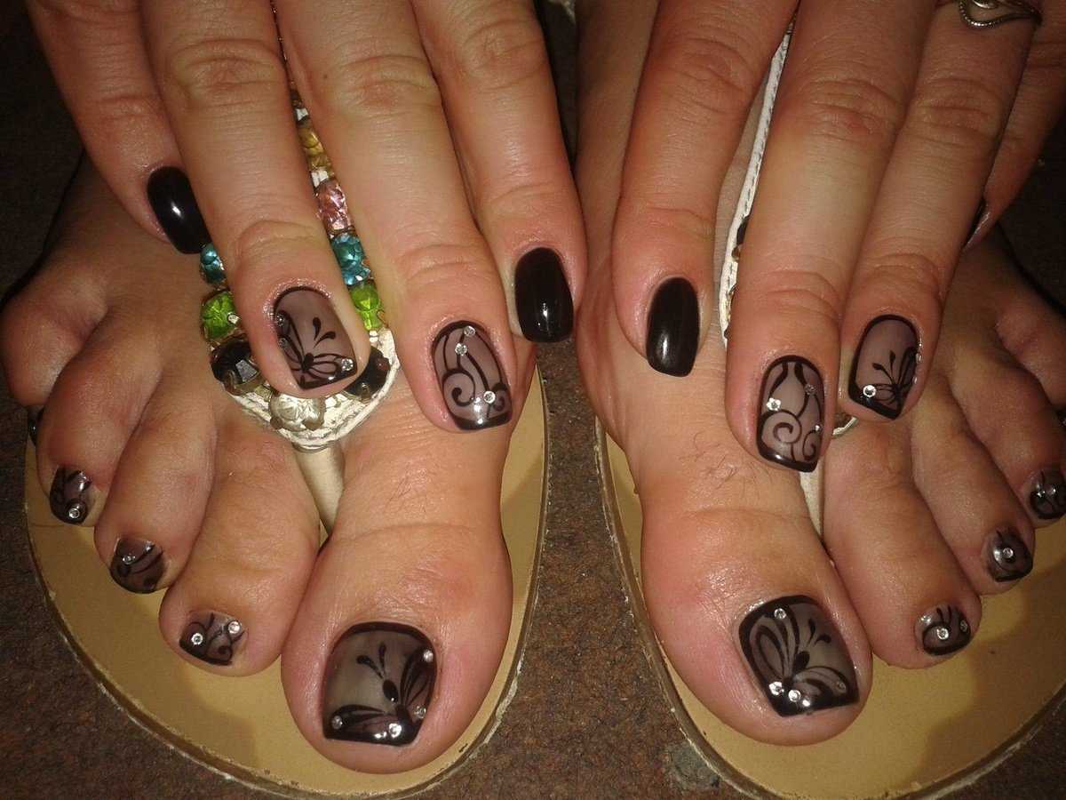 Педикюр со стразами в темных тонах