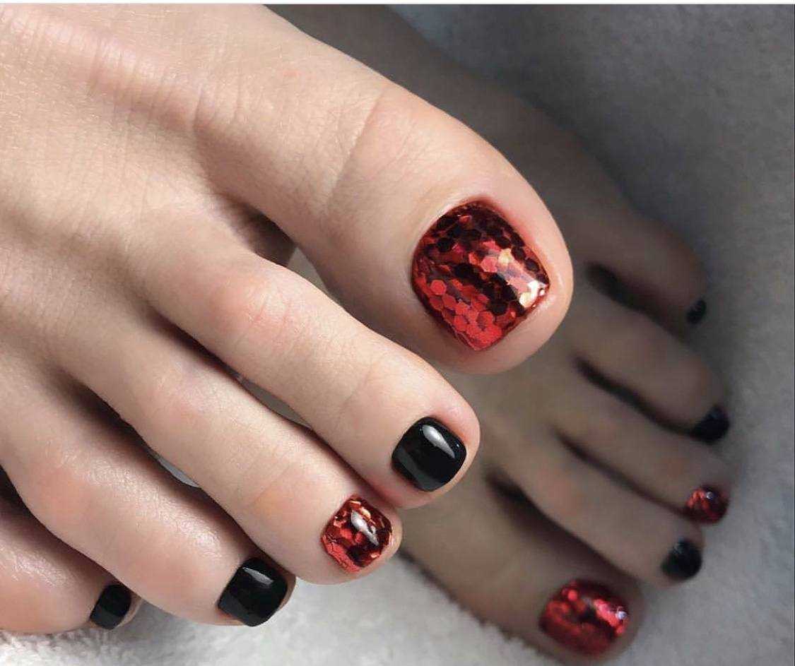 - черный педикюр с красным глиттером – отличное решение для праздничных нейл-артов. Глиттер отлично заменяет стразы, камифубуки и другой блестящий декор.