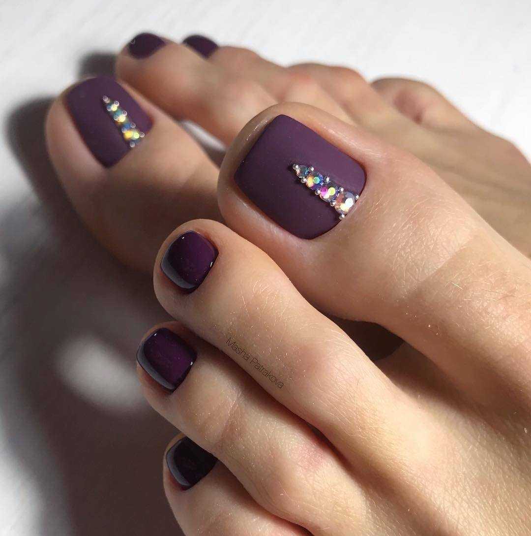 Дизайн с ромбом, выложенным стразами на большом пальце, отлично сочетается с темными тонами лака. Лунный маникюр со стразами в красном цвете — шикарный вариант для лета 2022 года. При создании темного педикюра рекомендуется использовать матовый топ, такой педикюр будет смотреться наиболее эффектно и выразительно.