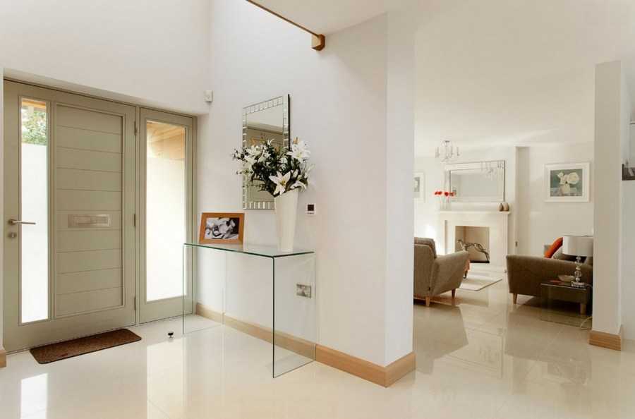 При проработке дизайна узкой прихожей, стоит предусмотреть две зоны: коридор и холл. Добиться этого можно за счет использования материалов с различной фактуры либо установки перегородки. Нередко у входной двери частного дома располагают кафель, а для отделки пола в холле используют ковролин либо ламинат.