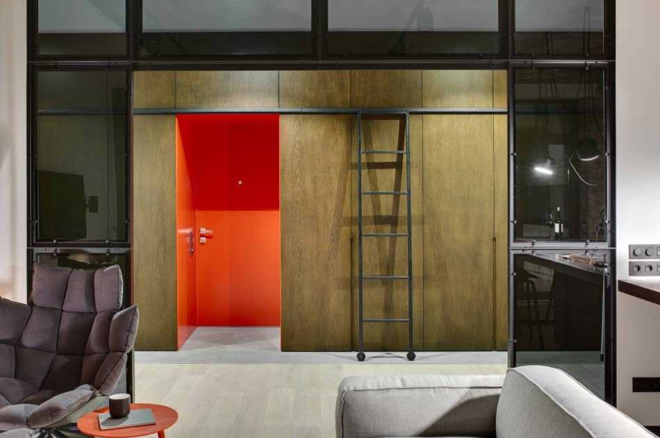 На фото прихожая отделанная обоями под кирпич. Интерьер выполнен в стиле лофт.
