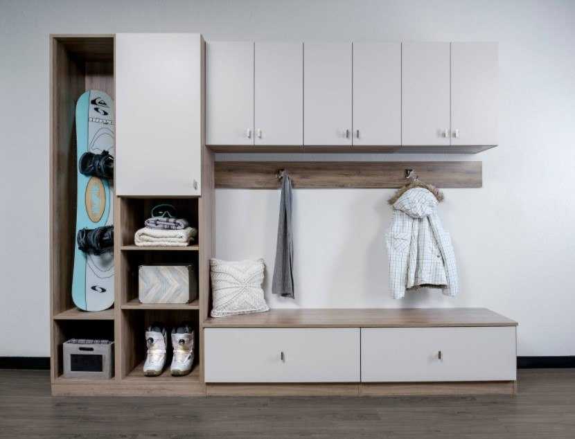 В наборы входят шкафы для одежды, комоды, обувницы, шкафчики для обуви с сиденьями, скамейки, вешалки, полки для головных уборов, антресоли, стеллажи, зеркала и другие предметы интерьера.