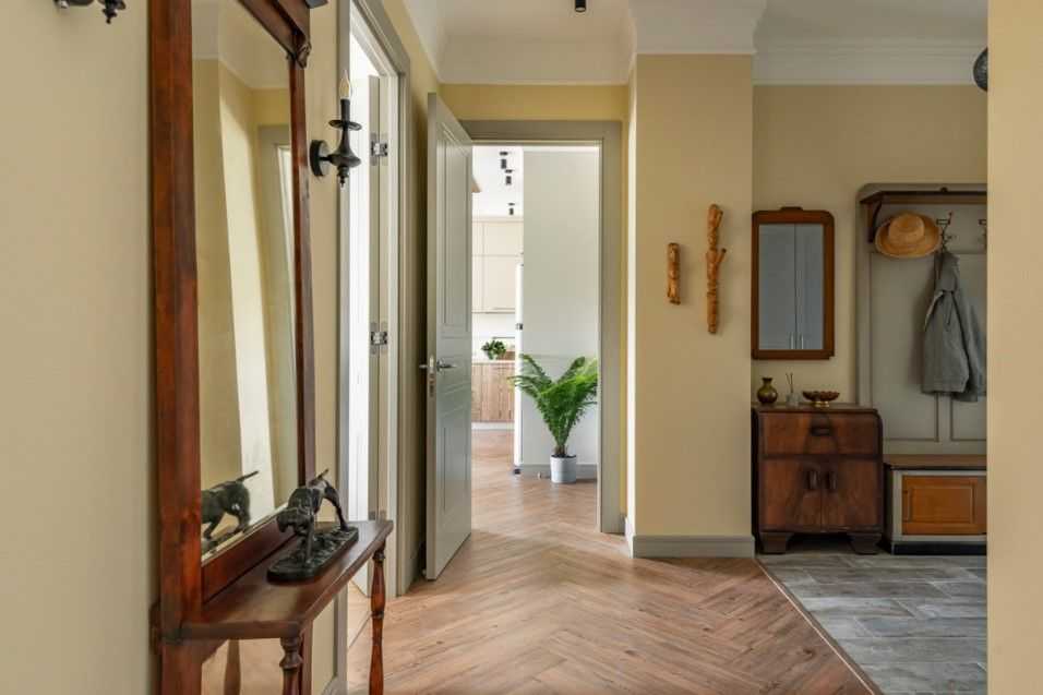 Мягкие оттенки стен, изящная мебель и предметы декора перекликающиеся по цвету создадут нежный классический интерьер прихожей.