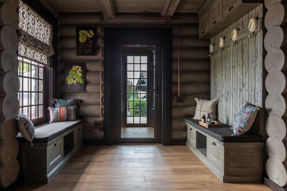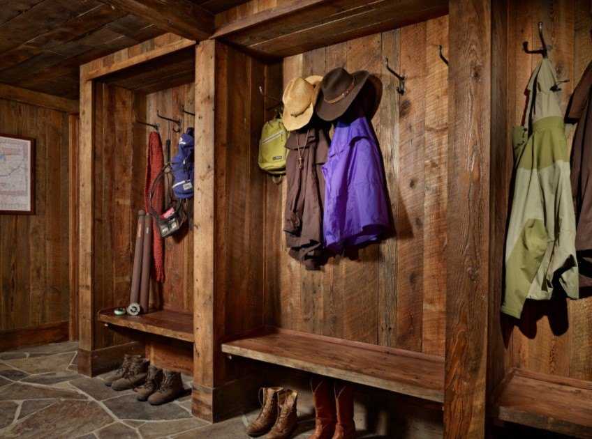 На фото компактная прихожая, в интерьере задействованы разные варианты отделки под природный материал.