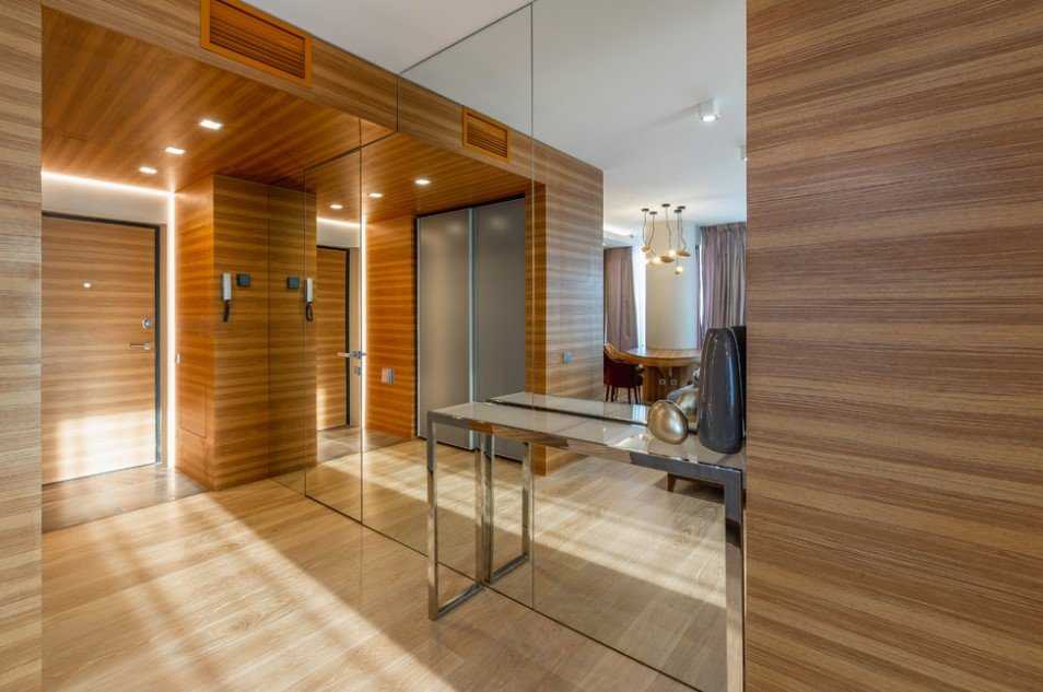 На фото прихожая с подсветкой на акцентной стене, отделанной ламинатом.