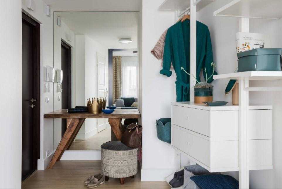 Здесь придется разместить минимальный набор самой необходимой мебели небольших размеров — обувницу с сиденьем, вешалку, шкаф-пенал для одежды.
