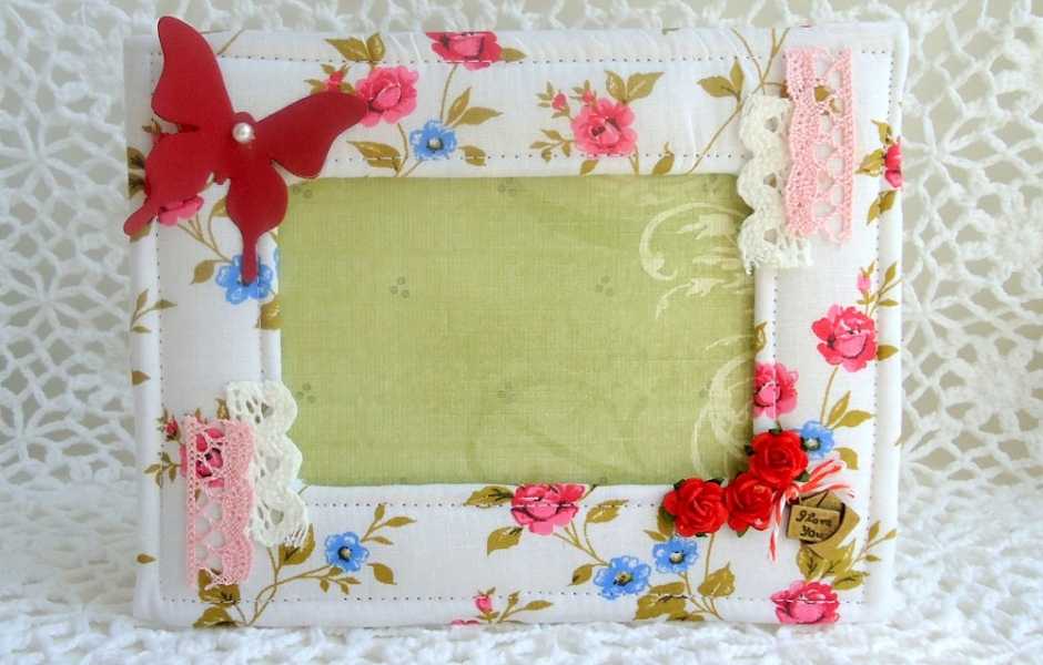 Также можно использовать любую старую вещь: прикладываем заготовку рамочки для фото к старой ненужной ткани и обводим мелом. Далее от каждой линии проводим параллельную на расстоянии, равном ширине рамки. Получается широкий прямоугольник. Далее вырезаем в ткани отверстие немного меньше, чем размер фото.