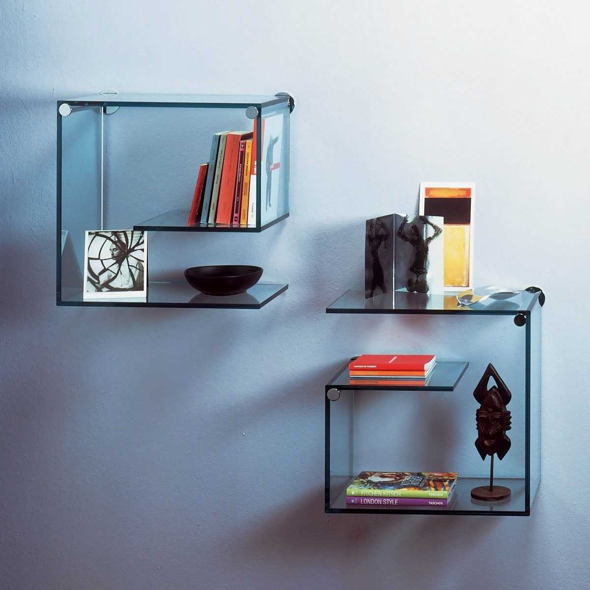 Стеклянные полки в любом дизайне смотрятся более эффектно и изысканно, нежели деревянные. Особенно, если на них расставлять не только непосредственно книги, но и маленькие красивые безделицы: вазочки, статуэтки, подсвечники. На таких поверхностях нередко можно увидеть коллекции кубков, которые весят немало. Поэтому, конструкции такого типа изготавливают из закаленного стекла, способного выдерживать вес до 15 килограмм.