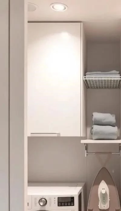 Хранение от пола до потолка – это оптимальное решение для небольших прачечных. Высокие шкафы и стеллажи позволяют максимально использовать вертикальное пространство, вмещая все необходимое: моющие средства, белье, гладильную доску и многое другое. Такая организация визуально увеличивает высоту помещения и создает ощущение порядка. Навесные шкафчики до потолка особенно актуальны, если площадь прачечной ограничена.