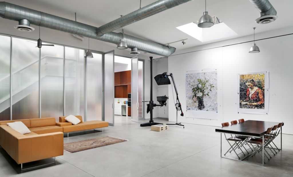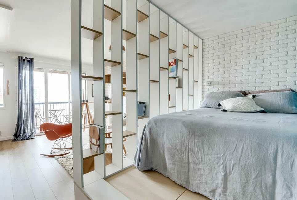 - Стационарные декоративные. Такой вариант разделения большой площади на отдельные зоны удобен в тех случаях, когда надо выделить место под рабочую зону, детскую или спальню, но при этом сохранить общее пространство. Такой способ деления комнаты часто встречается при проектировании ремонта квартиры в стиле лофт. Такие перегородки обычно сооружают в виде стеллажей с полками или полупрозрачных стен из стекла, дерева или пластика, сохраняя общий стиль, но при этом говорить о шумоизоляции выгороженных частей комнаты не приходится.