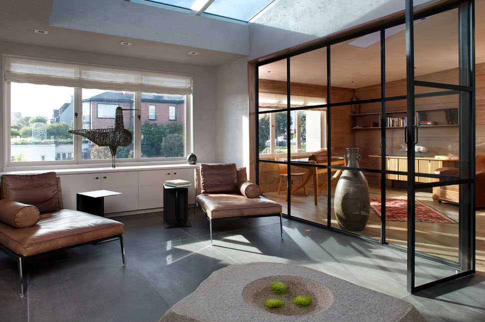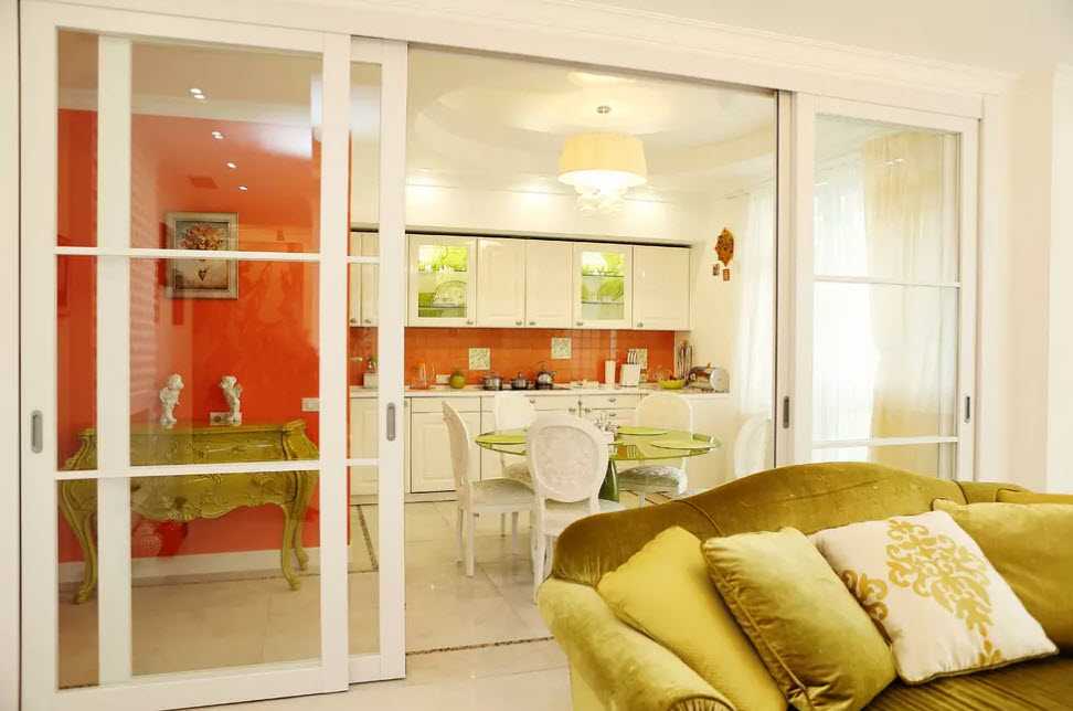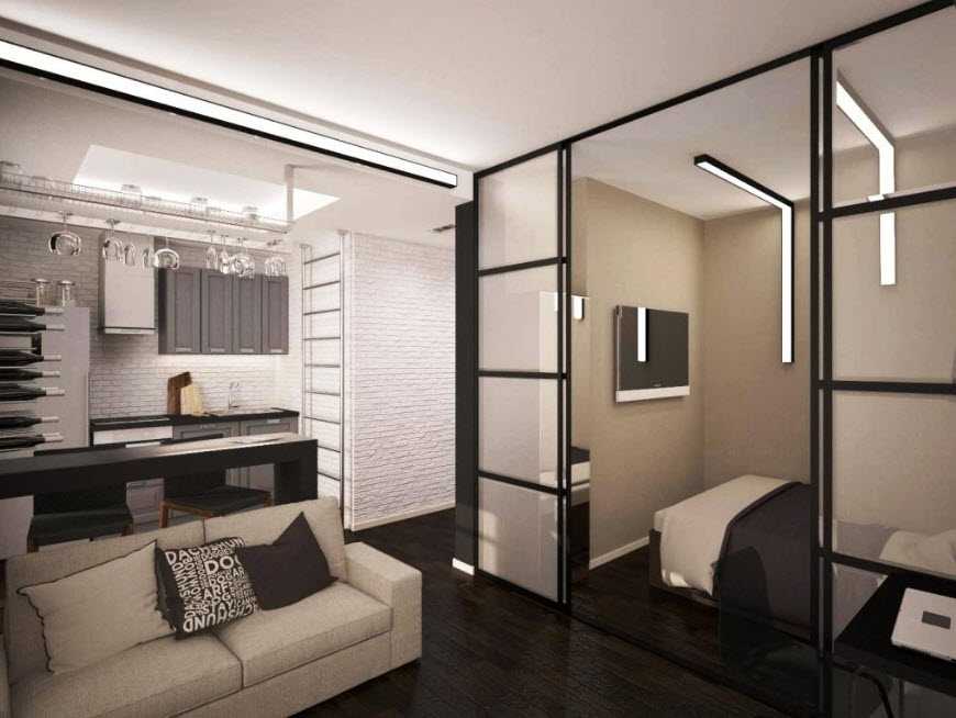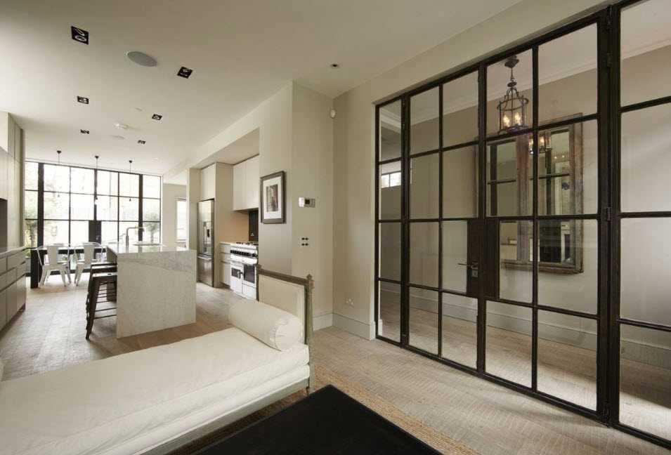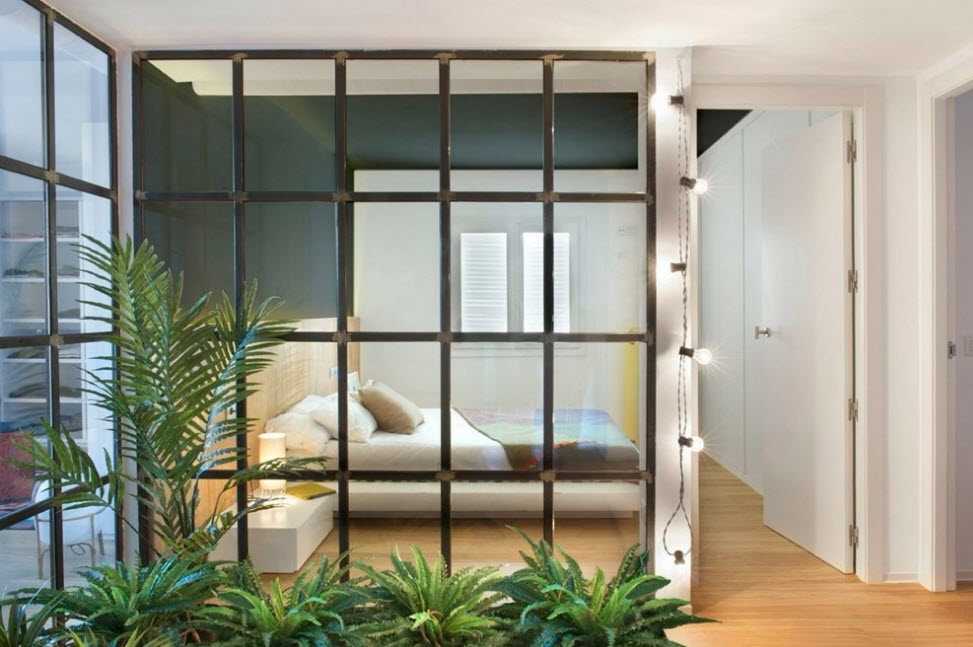 Традиционный вариант – каркасная перегородка из стекла между зоной приготовления и приема пищи, между столовой и гостиной, кухней и гостиной. Во входной зоне перегородки позволяют отделить гардеробную от коридора или комнаты, визуально разграничить прихожую и квартиру. Стеклянные прозрачные и непрозрачные конструкции прекрасно подходят для создания мини-кабинета, декоративного деления комнаты на спальню и гостиную.