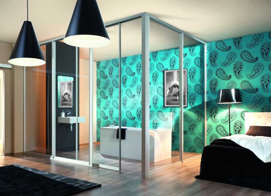 Размещают стеклянные перегородки чаще всего на границе между различными зонами в одном помещении. Так, перегородки в виде стеклянного куба устанавливают для отделения спальни хозяев от гостиной, тот же прием применим и для выделения детской в общей комнате с родителями. В некоторых современных студиях ванна расположена в непосредственной близости от кровати, а то и прямо в зоне спальни. Вместо обычной перегородки из стекла лучше установить сплошную, герметичную конструкцию с раздвижными дверями, что убережет хозяев от излишней влажности.