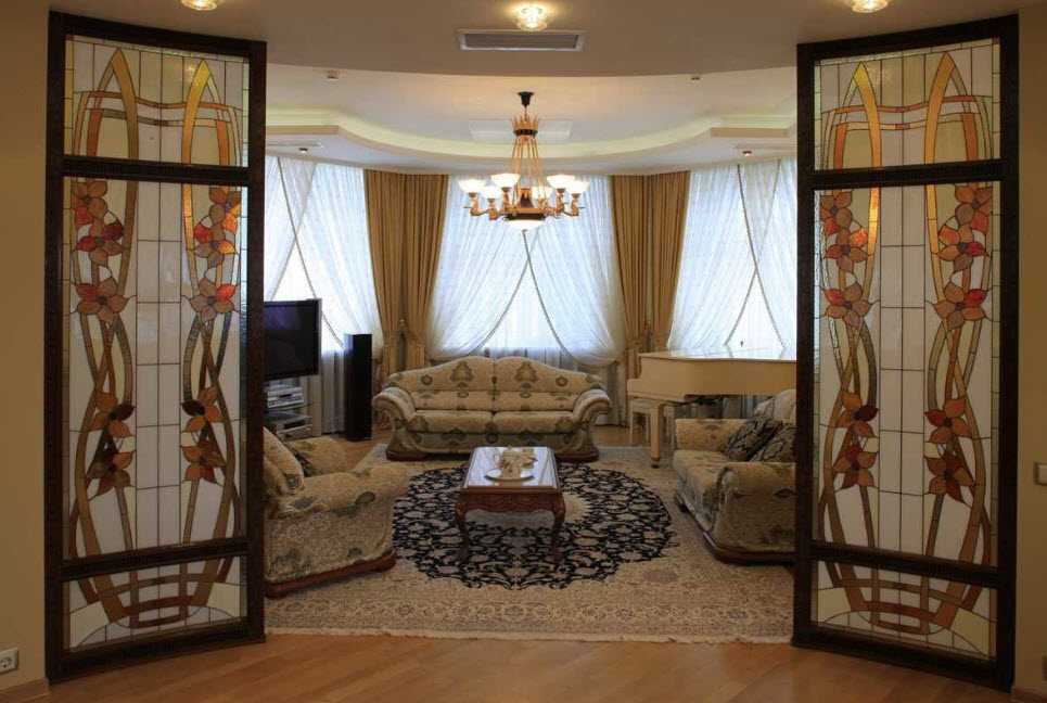 Сложные художественные витражные и мозаичные перегородки – роскошный декоративный элемент. Даже в заводском исполнении они стоят дороже, не говоря уже о ручной работе. Зато такой интерьер точно будет роскошным и индивидуальным, особенно – в вычурных классических стилях.