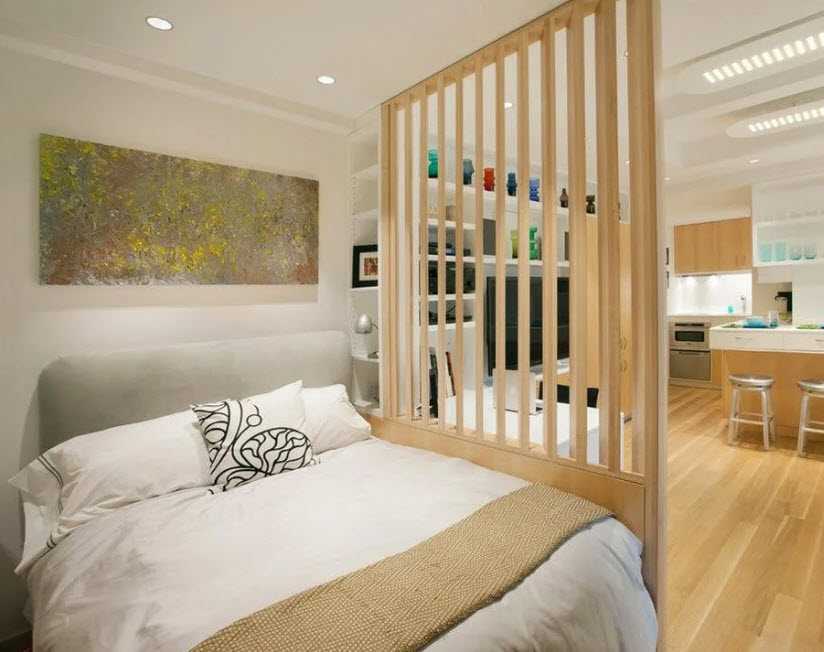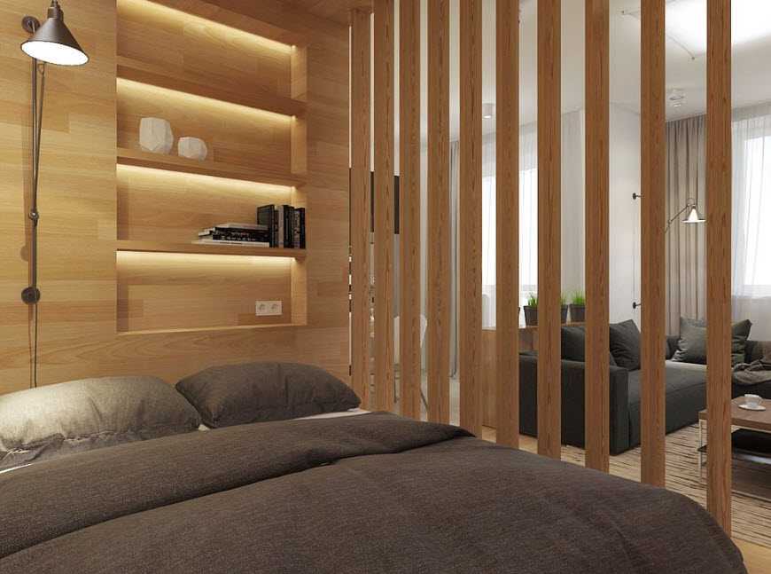Спальная комната. Обычно здесь используют перегородки для того, чтобы отделить рабочую зону, создав небольшой личный кабинет. В качестве разделителя функциональных зон лучше использовать классическую ширму или компактную раздвижную перегородку.