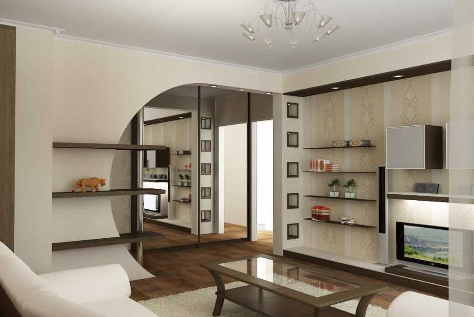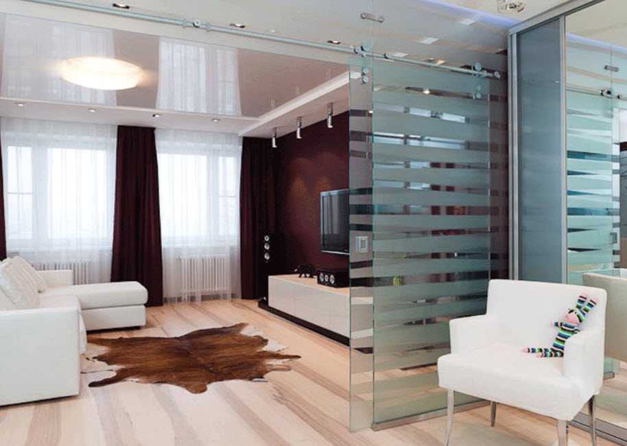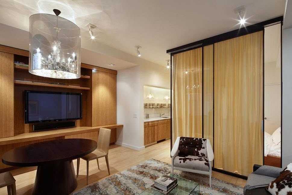 Чаще всего требуется разделить места для отдыха и для приема пищи. Красивая ширма или стильная перегородка из стекла способны решить эту проблему и добавить функциональности в помещение. Материалы лучше подбирать под основные цвета и формы мебели в гостиной.