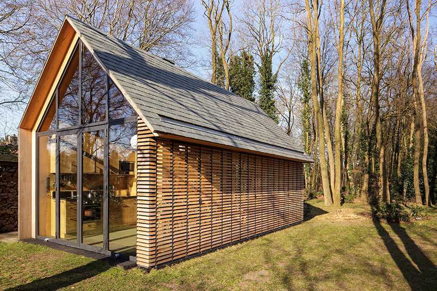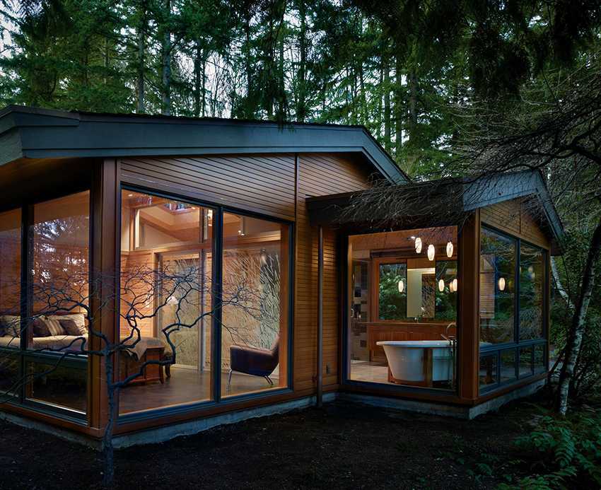 В лесной зоне можно построить дом с панорамными окнами, чтобы круглосуточно наслаждаться видом.