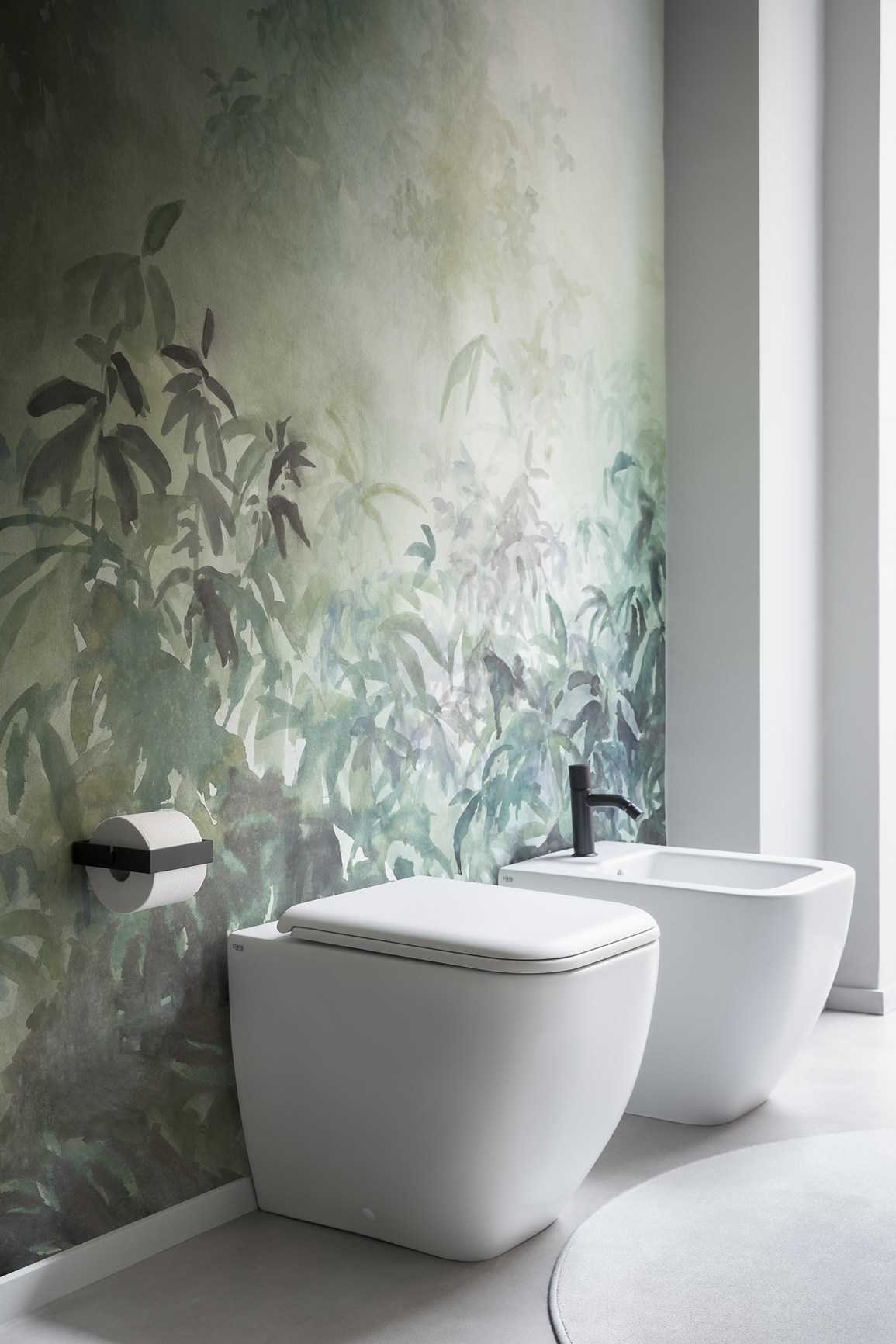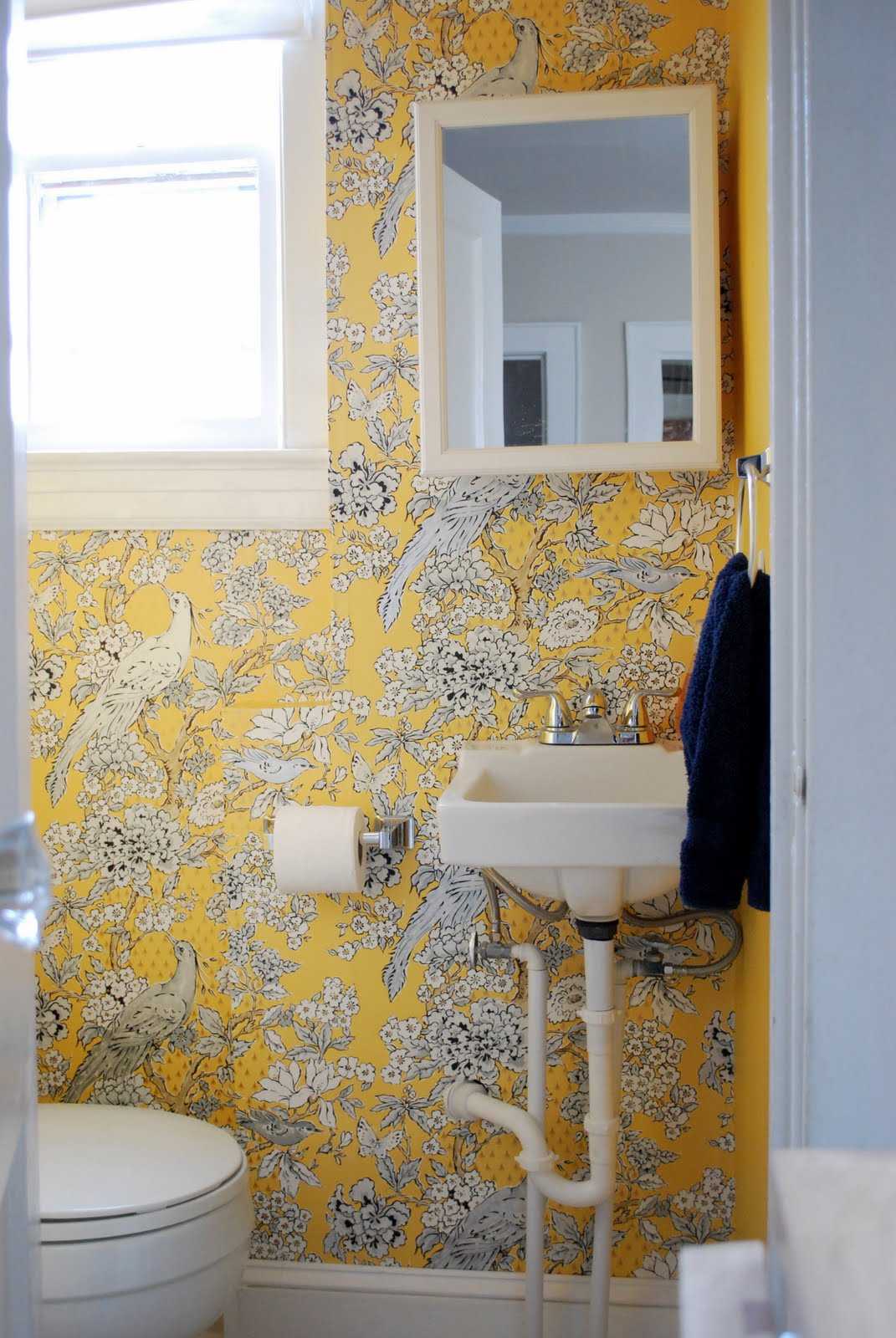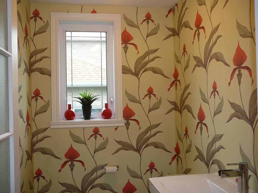 Декоративные полотна прекрасно комбинируются с другими видами отделки для туалета. Особенно востребован дуэт с кафельной плиткой, которой оформляют нижнюю поверхность стен возле сантехники. Визуально улучшается ощущение пространства в компактной комнате гигиены, если выбрать светлые обои с едва заметным рисунком во флористическом стиле и плитку на тон или два темнее на всю нижнюю часть стен туалета.