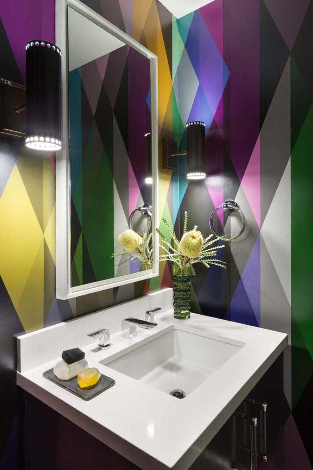 При использовании насыщенных оттенков в компактной ванной необходимо в качестве фона выбирать нейтральные цвета. Выигрышный вариант оформления одной стены ярким цветом (оранжевый, фиолетовый, зеленый). Оригинальны стены, отделанные красными плитами с добавлением оливковых и белых блоков.