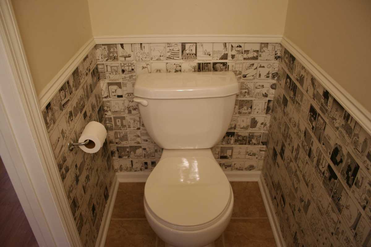 В дизайне туалета встречаются интересные комбинации плитки с другими отделочными материалами. В санузле используются влагостойкие обои, декоративную штукатурку, дерево. Из соображений практичности, плиткой облицовывают нижний уровень стен или часть помещения, наиболее подверженную загрязнению.