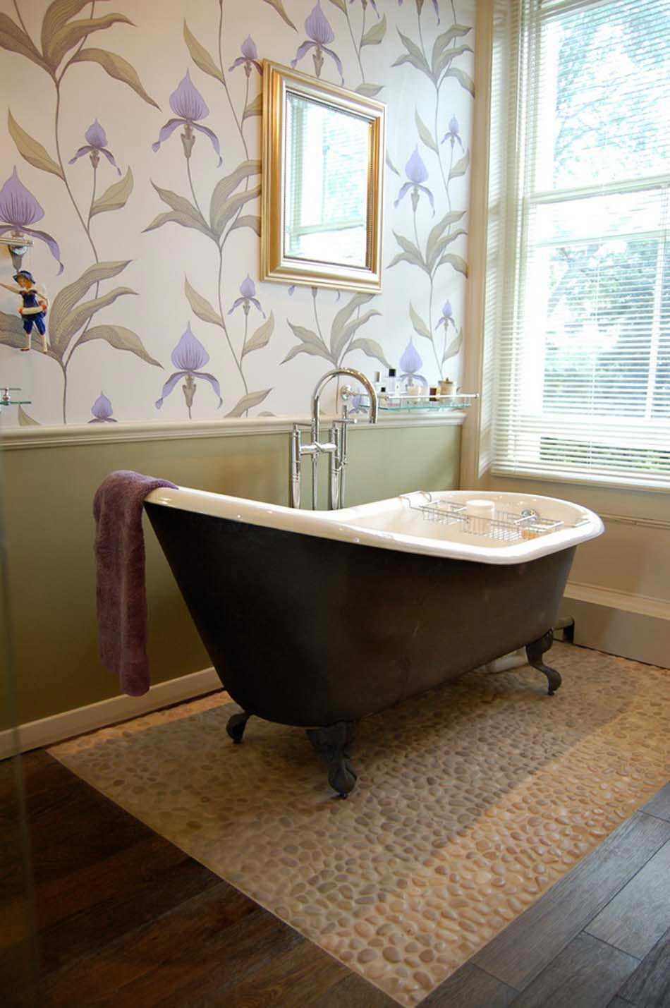 Прованс соотносится с Францией, лавандовыми полями, солнцем и виноградниками. В этом интерьере доминируют лилово-белые и белые с зеленым тона. Организовать хранение вещей помогает небольшой шкаф над унитазом, сама сантехника белая. Обои подбирают с цветочным узором либо в полоску фиолетовых оттенков. В таком ключе выполняется и дизайн маленькой ванной комнаты без туалета – с круглой ванной и белой раковиной.